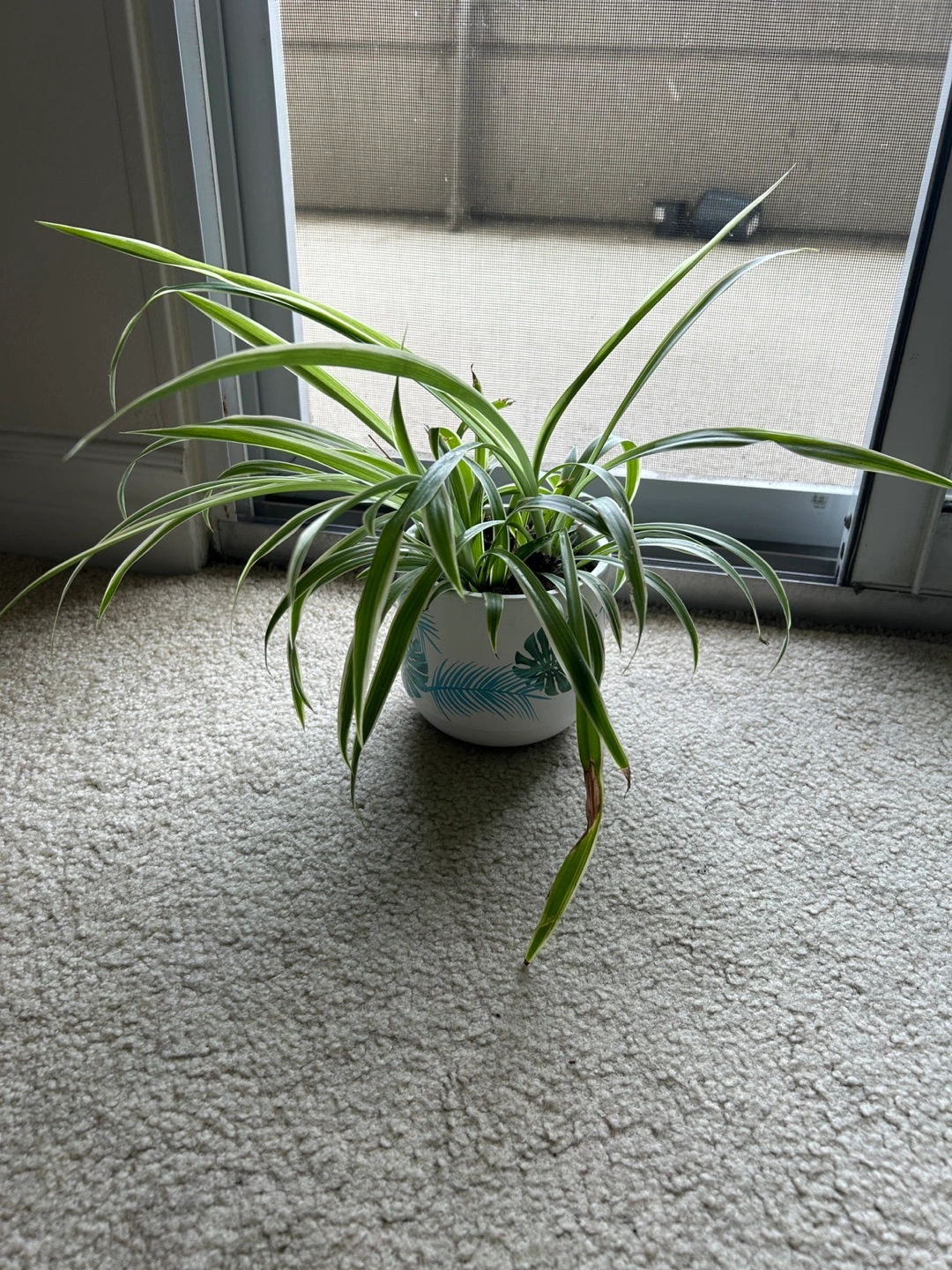 I'm selling this charming spider plant. The plant is sitting in a decorative pot with a tropical design, offering a pop of colour. Adding a plant like this can create a more tranquil environment in your home.