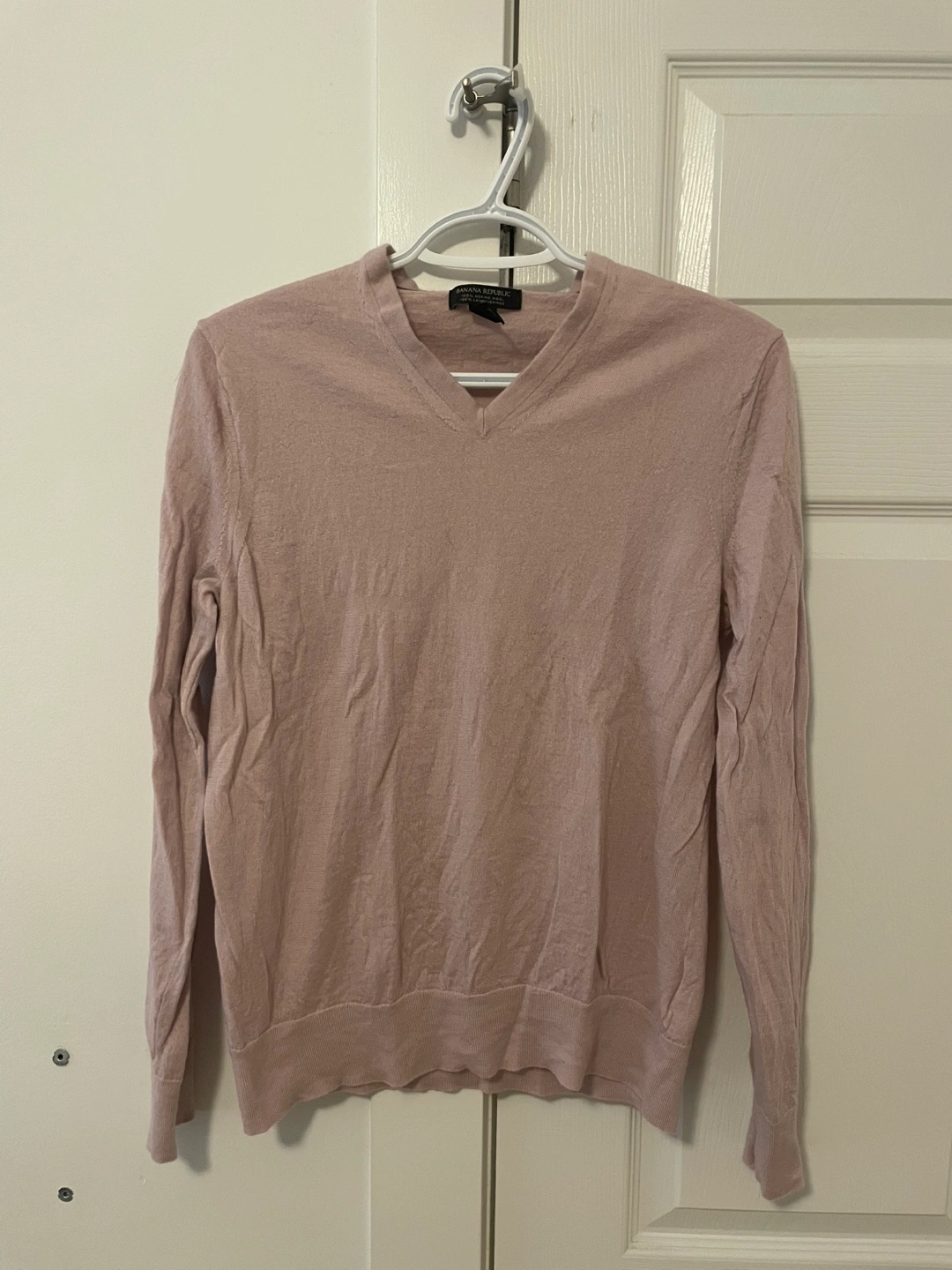 A soft pink coloured sweater. V-neck design and made of merino wool. This is a men’s medium