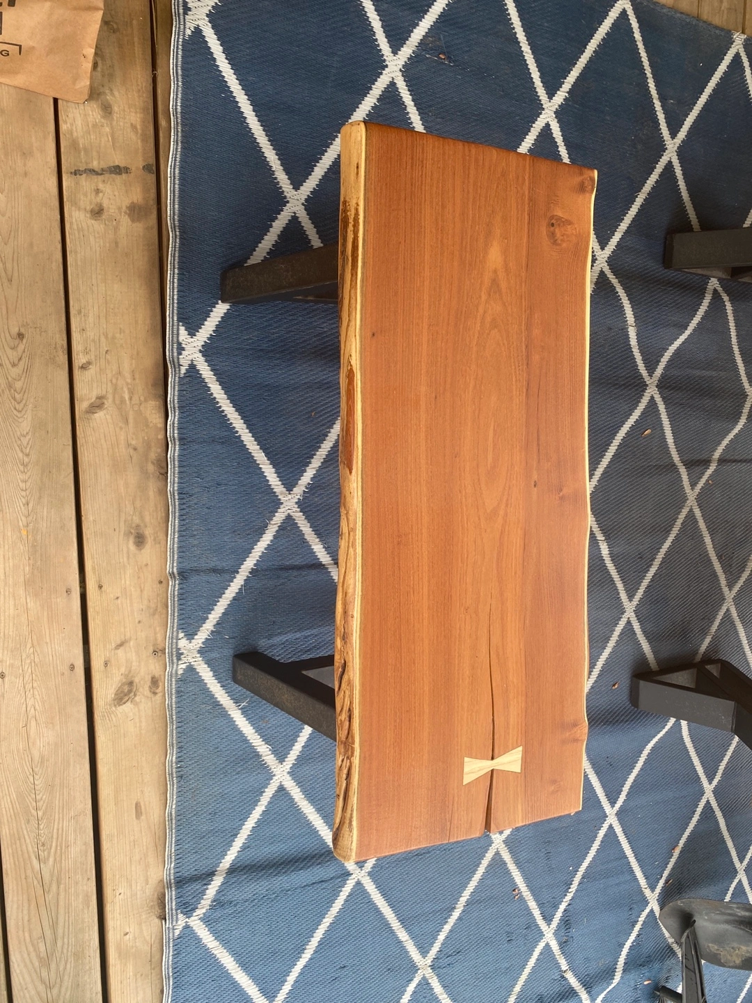 A beautiful bench. Features a gorgeous wooden top with natural edges. Supported by black metal legs. Such a bench would be a perfect addition to your living room or your backyard.