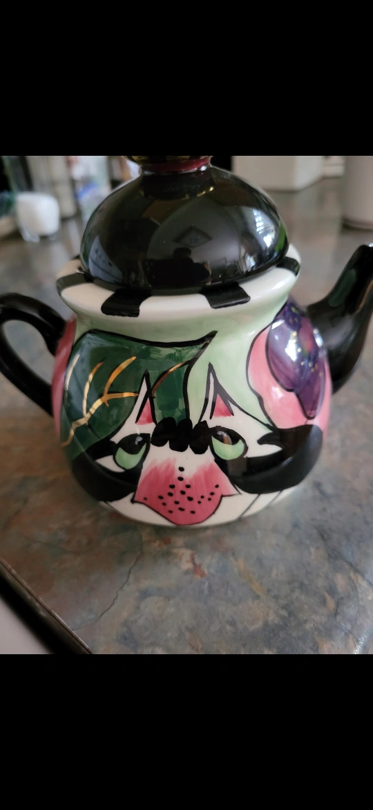 A decorative teapot with a painted cat face. Floral designs and a black lid. The bottom appears to have signatures. Enjoying a tea from this teapot is a wonderful way to relax after a long day.