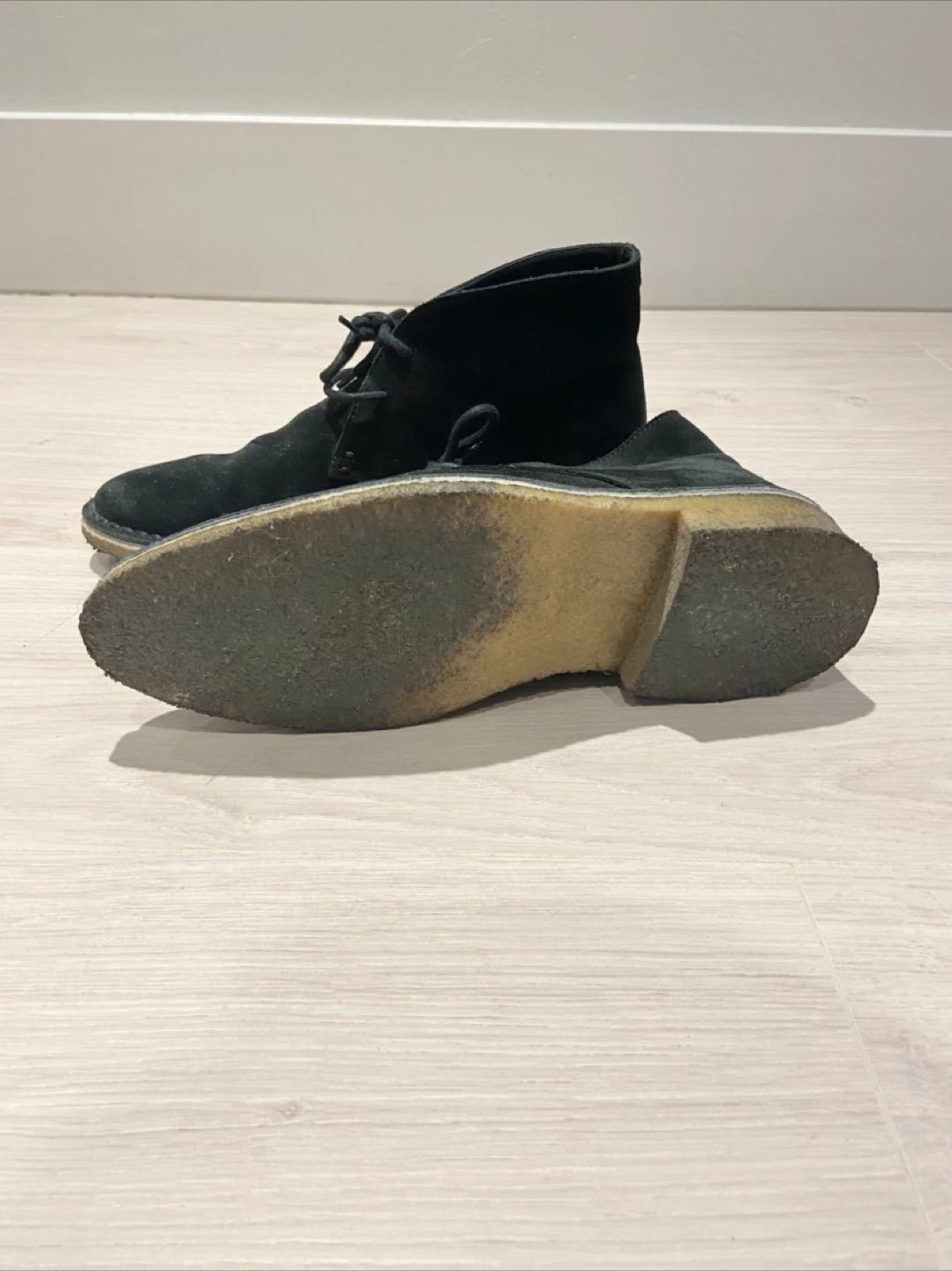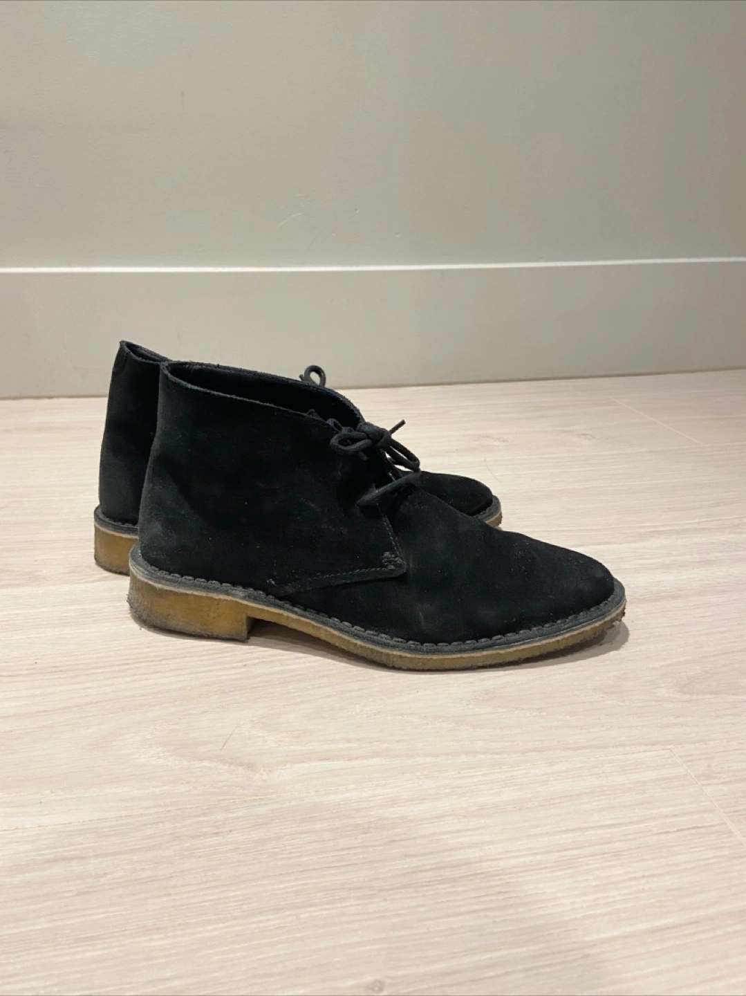 A pair Clarks Originals of deep navy blue suede chukka laced boots with crepe sole. Women’s sized 6.5 M, slightly worn.