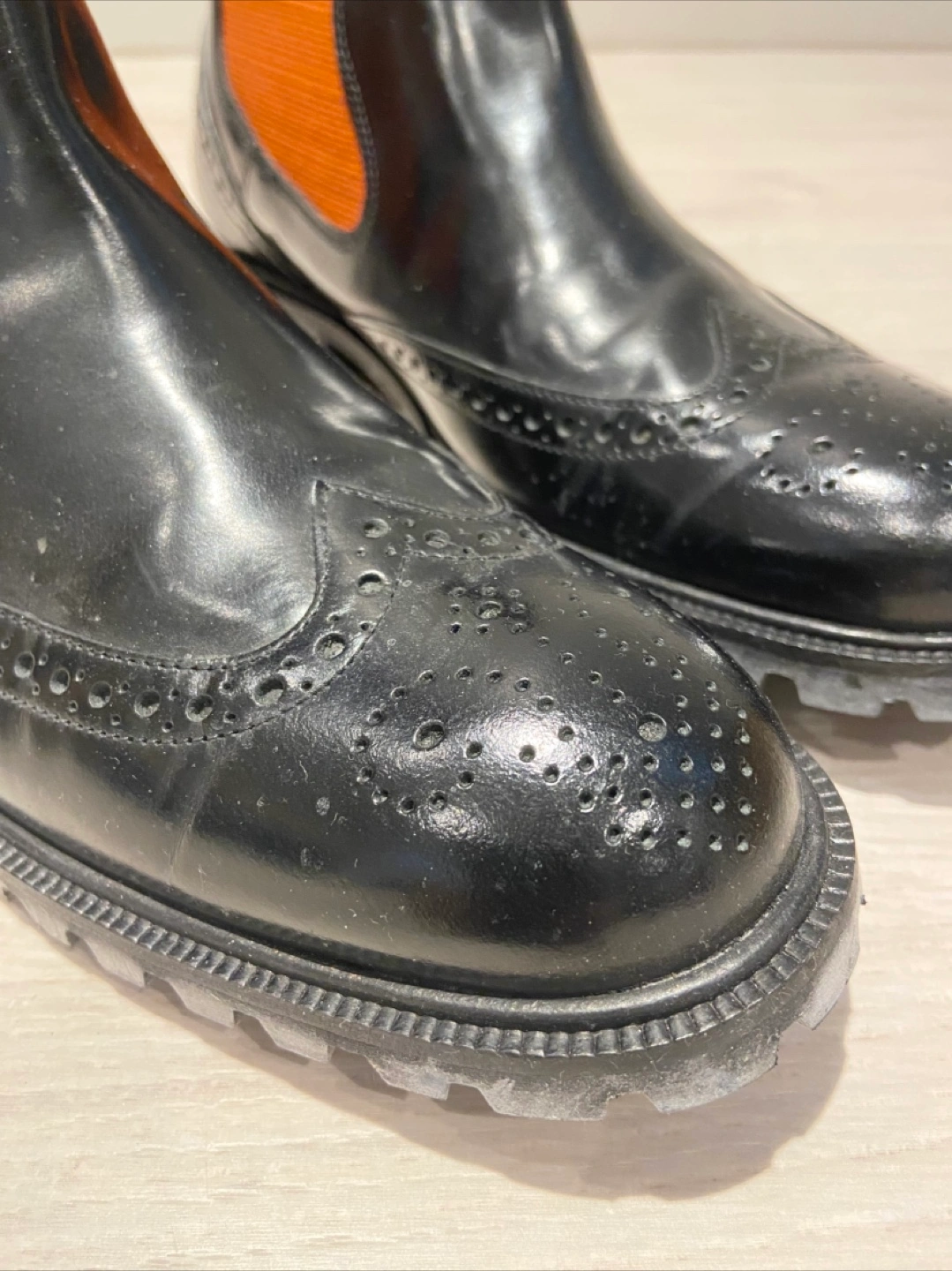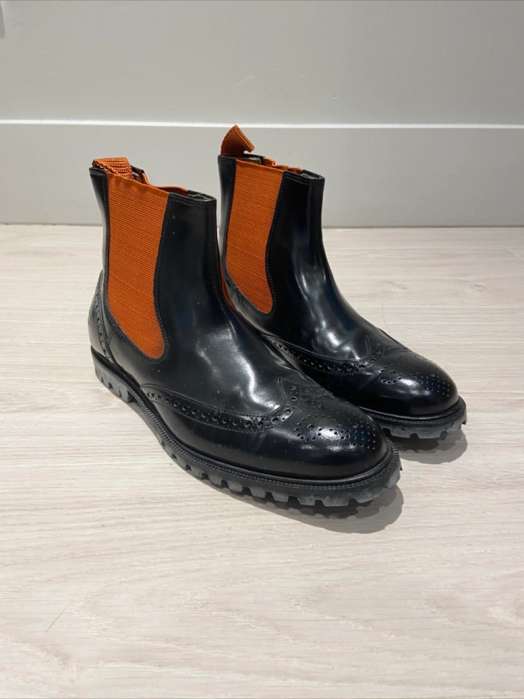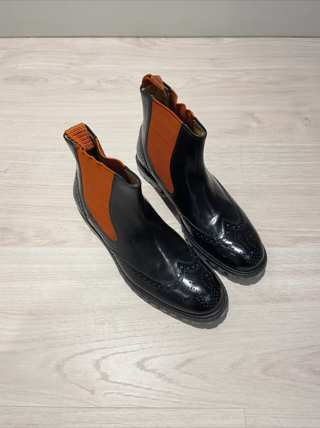 These black high shine leather boots features a brogue design on the front with orange elastic side panels and a pull tab. Super comfortable and stylish boots – ready for your next adventure dressed up or down.