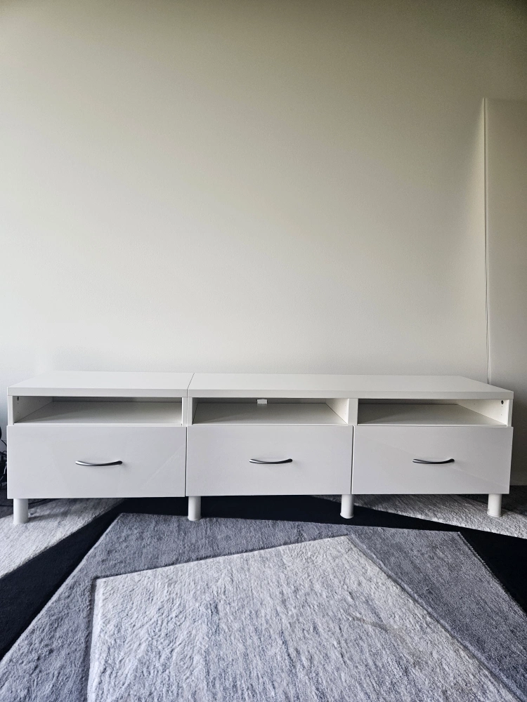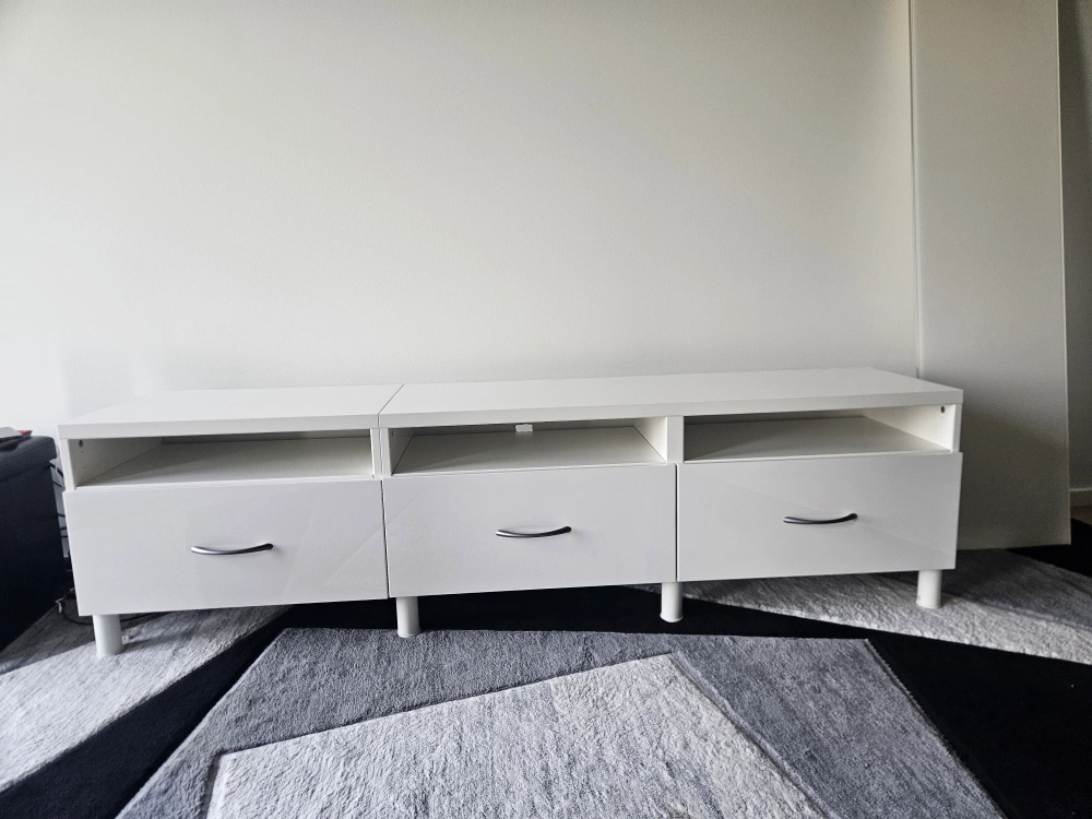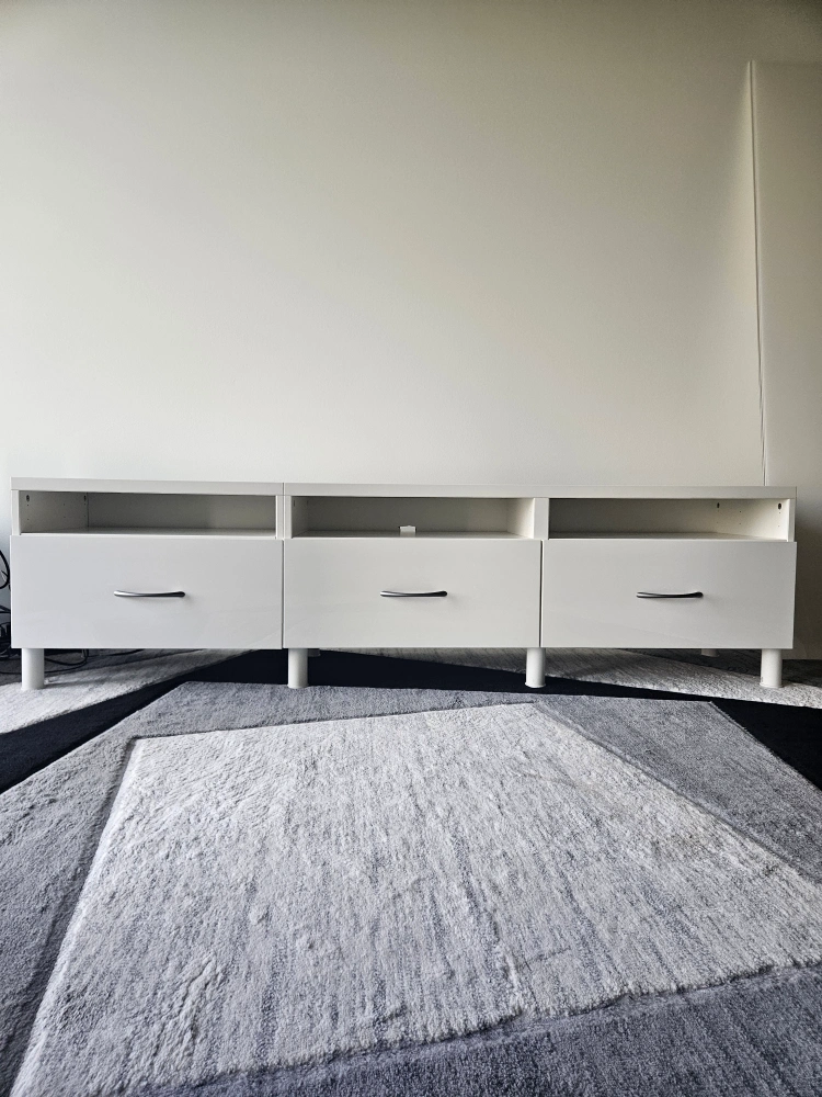 Moving sale! White ikea TV stand. The stand has three sections with drawers and open shelves. It has a glass topper and short, white legs.