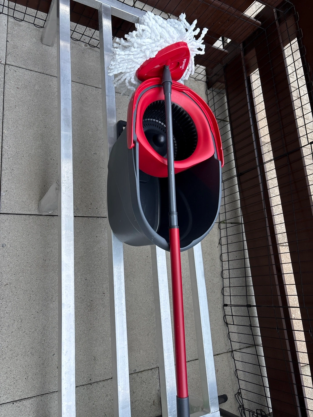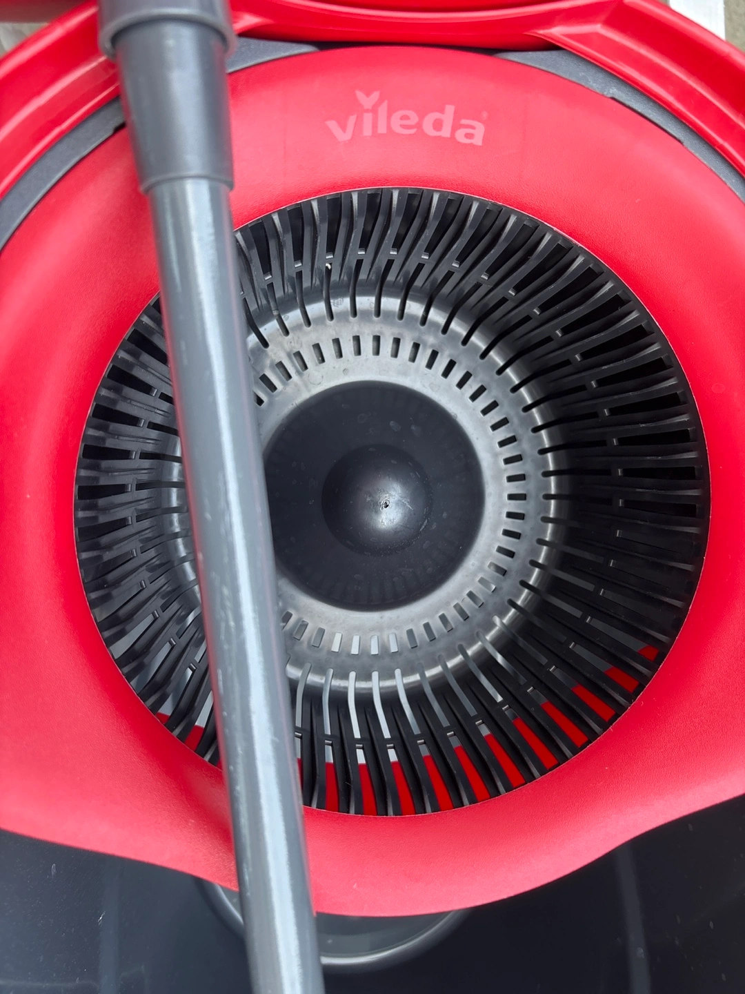 Complete mop and bucket set. Red and grey plastic bucket. Features a spinning mechanism. Includes the mop with a red handle. Perfect for an enjoyable cleaning session.