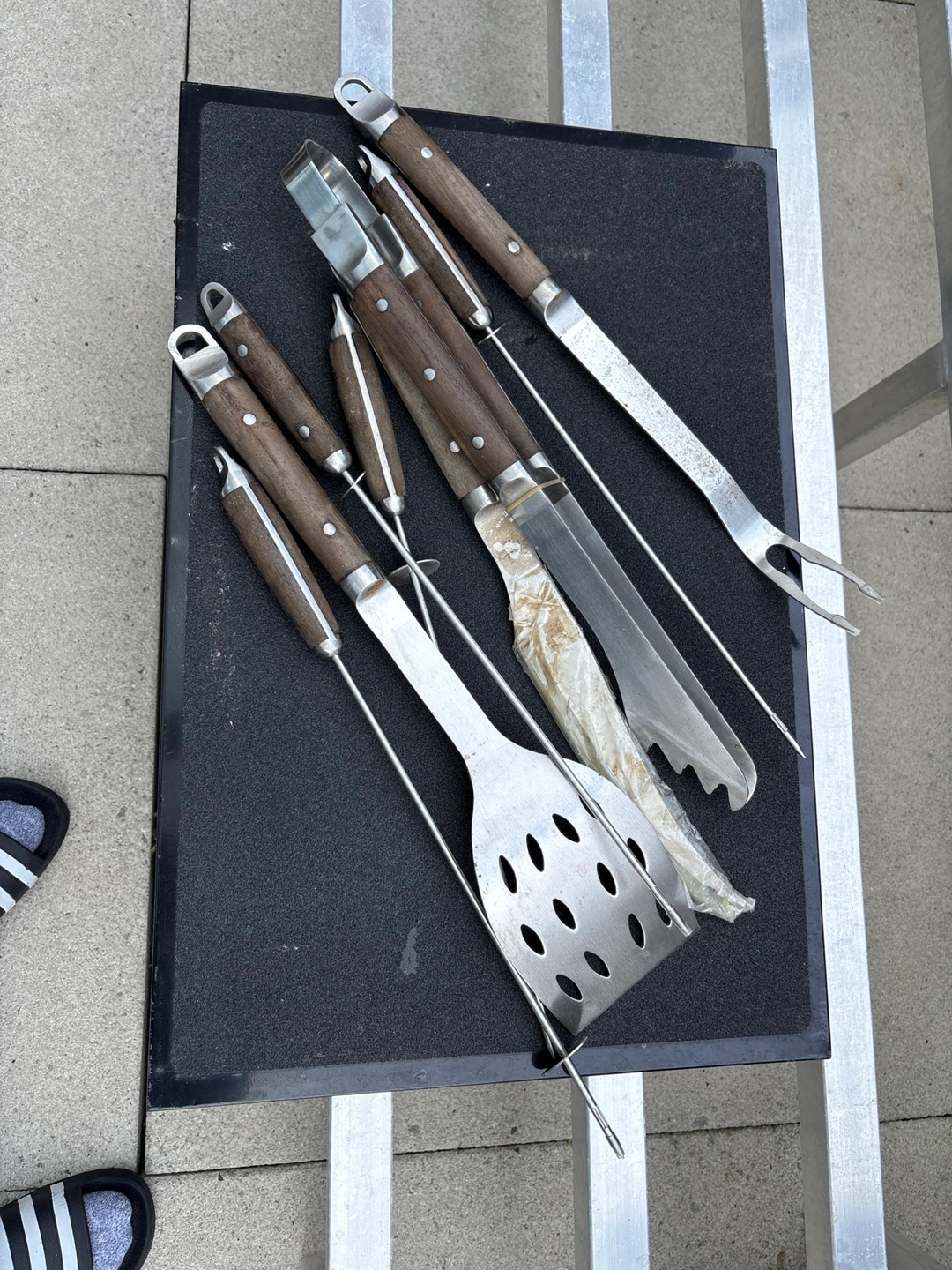 A collection of BBQ utensils. Stainless steel tools with wood handles. Includes a spatula, knife, and tongs. A complete set, ready for your next cookout. Take a deep breath and envision yourself grilling with these, it is a lovely thought.