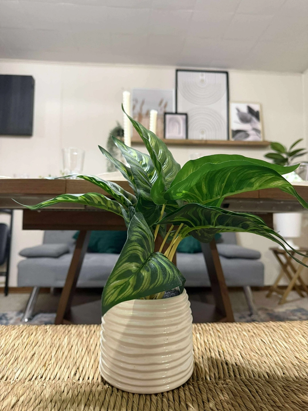 The plant has vibrant green leaves. The vase is a cream colour, with a ribbed texture. I imagine you could place this plant anywhere in your home and instantly feel a sense of tranquility.