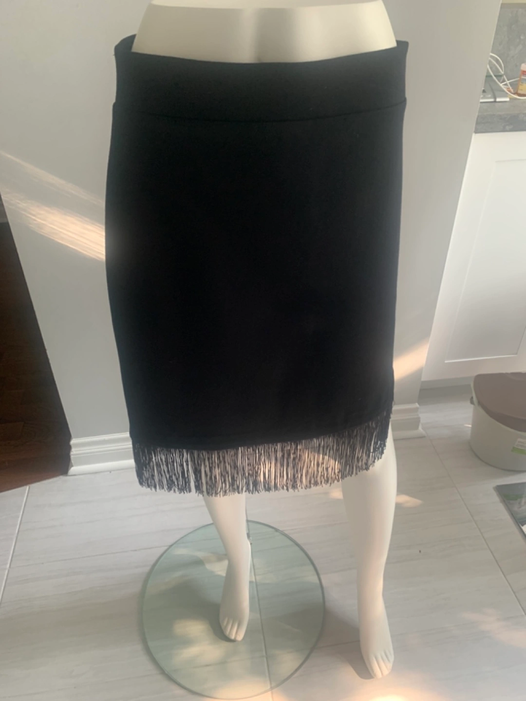 A black skirt with stretchy waistband and asymmetrical fringe detailing. Brand new. Never worn Measurements are flat lay: Waist (side to side): 15.25 inches Length (waist to hem): 25 inches on one side; 22 inches on the other side Hemline (bottom side to side): 20.5 inches