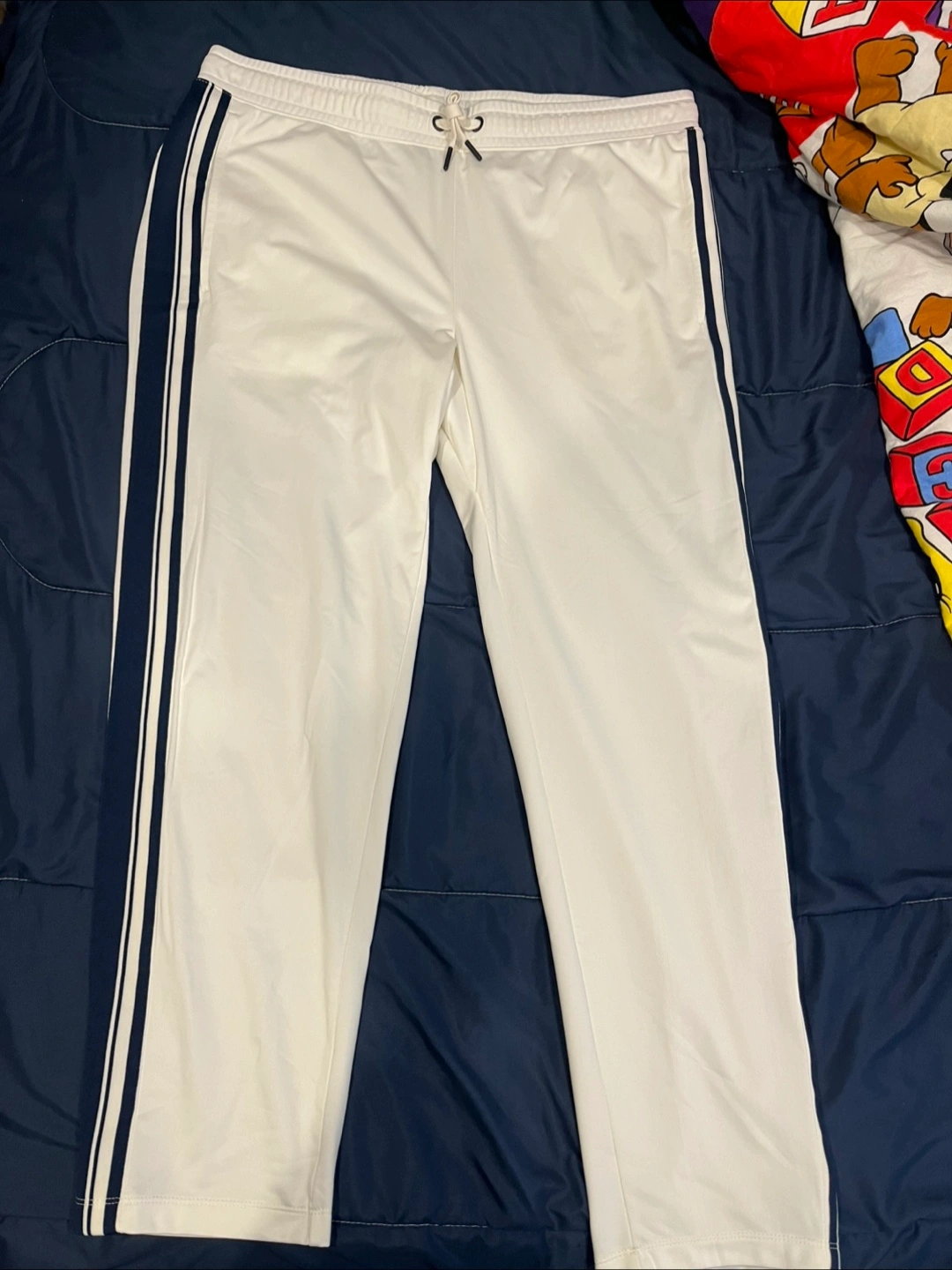 These track pants are a creamy white colour. They have navy blue stripes along the side. The pants feature a drawstring waist. Wearing these pants can really help you feel relaxed.
