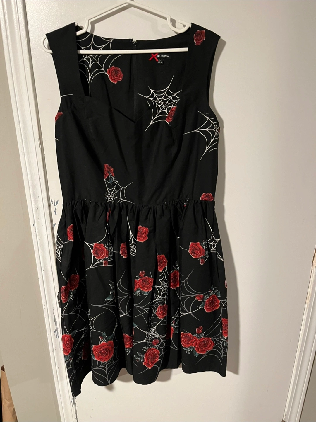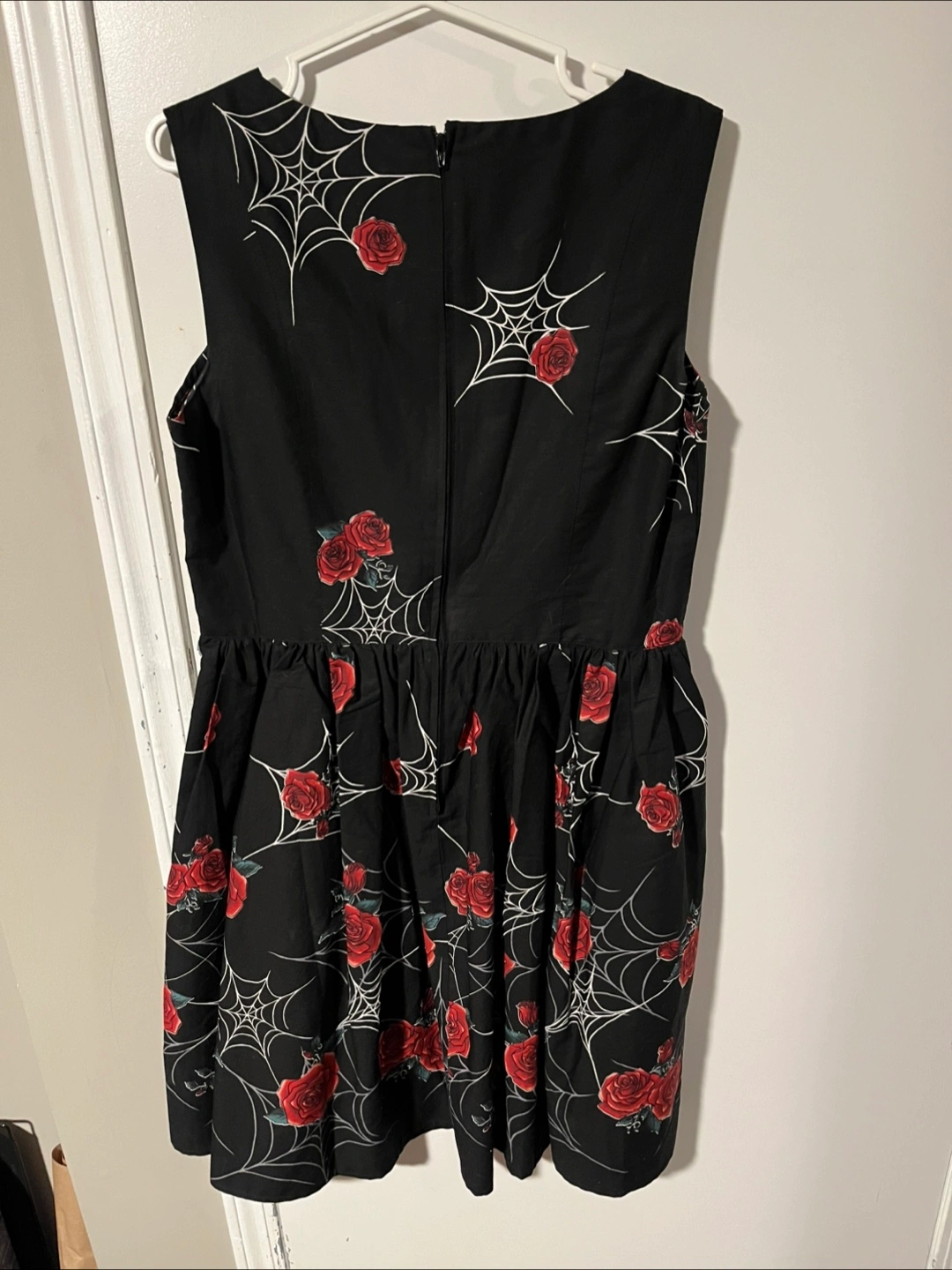 Sleeveless black dress. Features a rose and spiderweb pattern. Includes a zipper closure. Perfect for a relaxing afternoon.