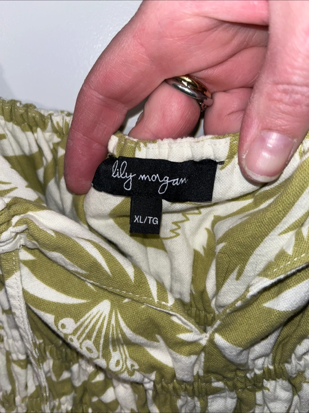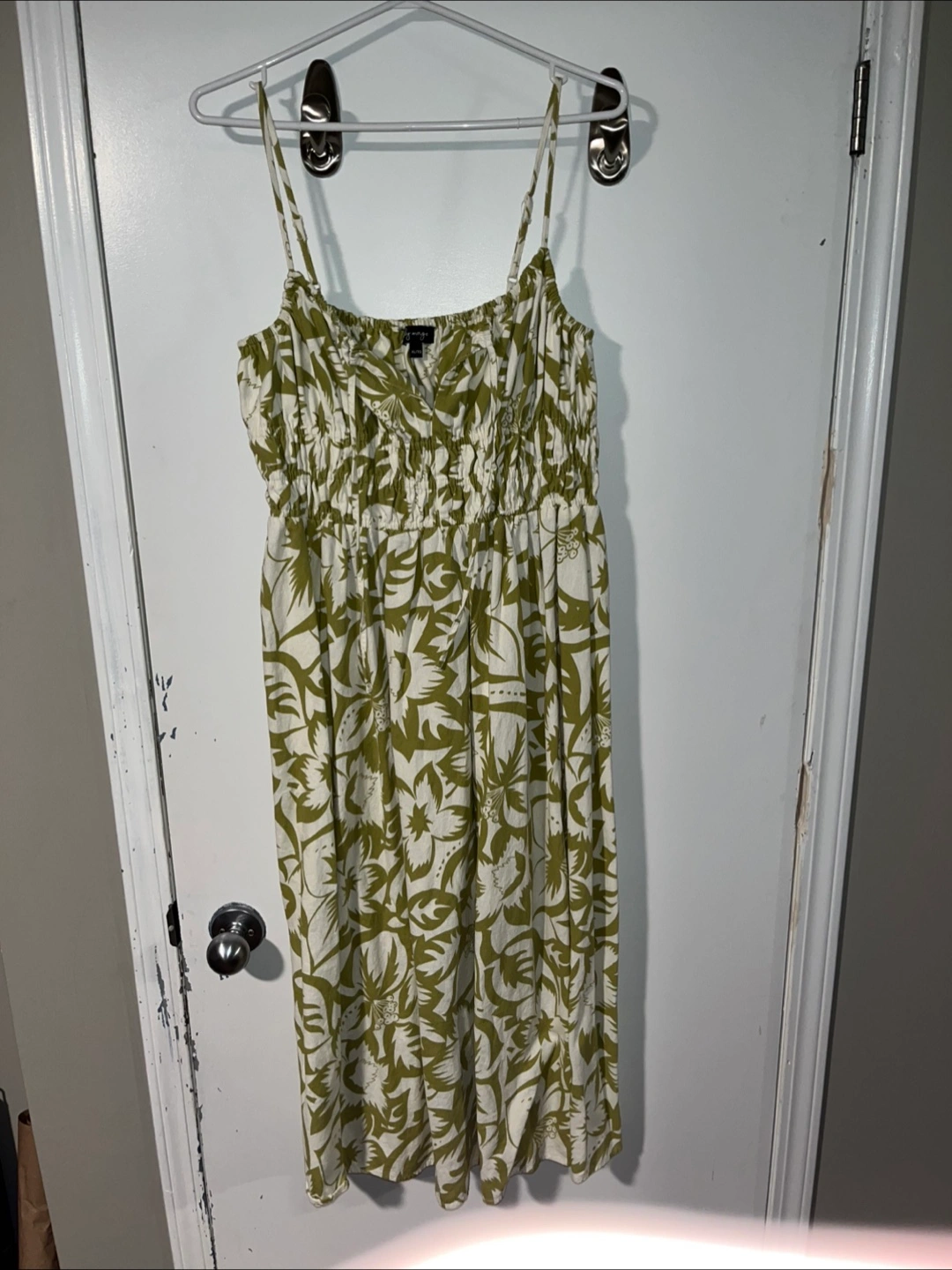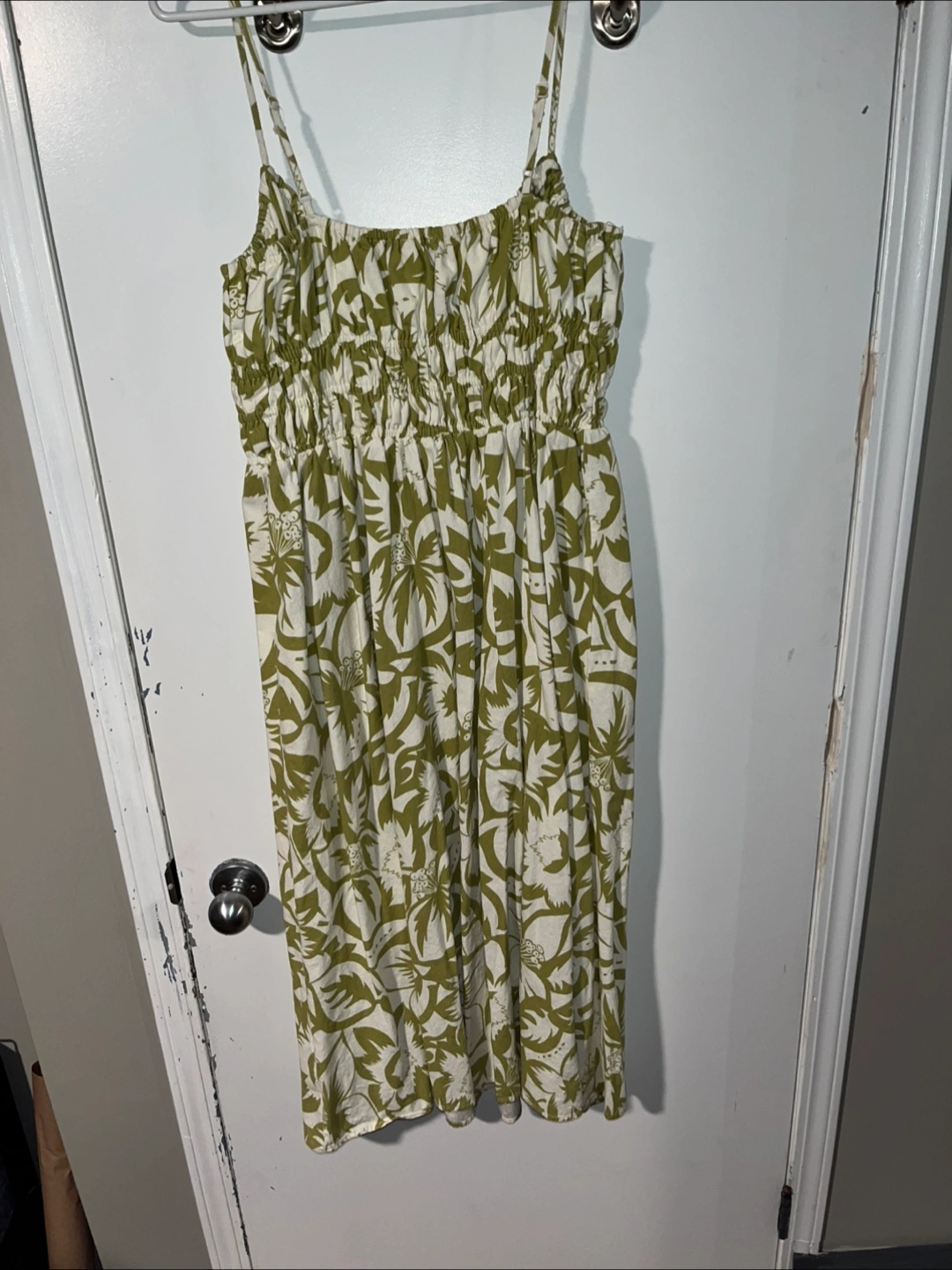 A beautiful summer dress. A white and olive floral print. Features spaghetti straps, with a shirred bodice. The dress is perfect for a warm summer day.