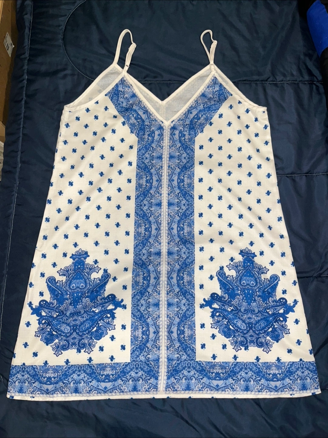 The dress features a striking blue and white pattern, with a V-neck and spaghetti straps. Designed for a breezy and comfortable feel, it can be an excellent addition to your wardrobe.