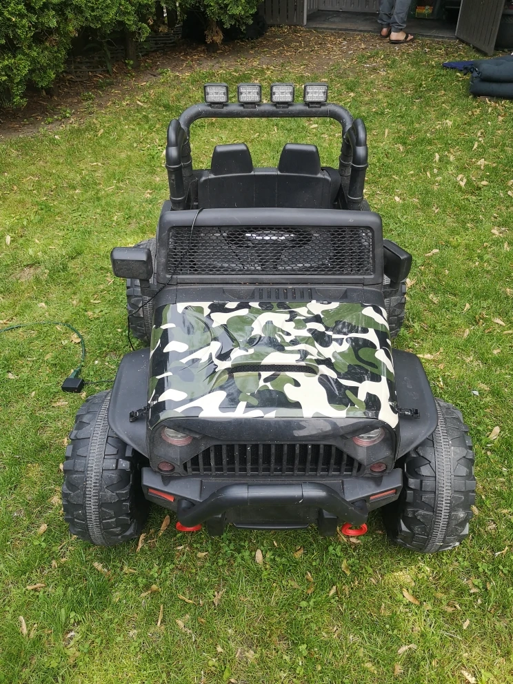 Features large tires and a camo design. Steering wheel and seatbelts are also included. Bluetooth. Comes with remote and charger. Great condition. Kept in shed.