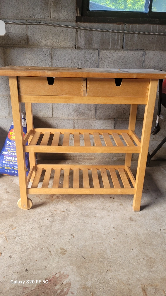 A wooden kitchen cart with drawers and shelves. Offers a handy storage solution. Perfect for keeping all your things organized.