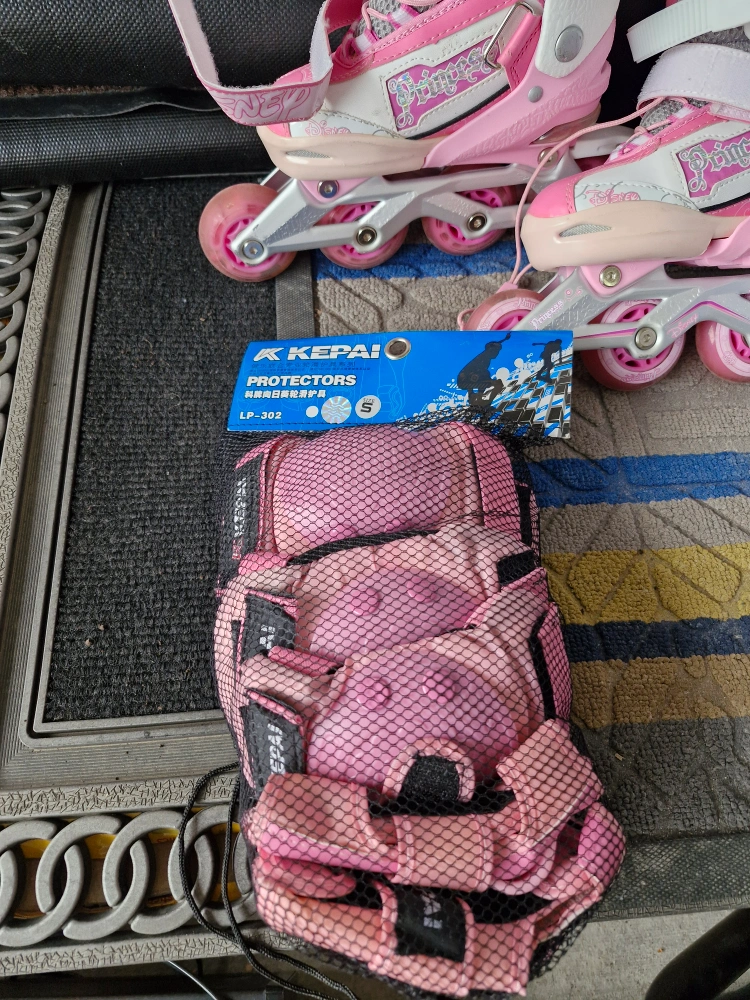Pink and white roller skates, with a design featuring the Disney Princesses. Includes buckles and laces to adjust the fit. Great for outdoor fun on a sunny day.