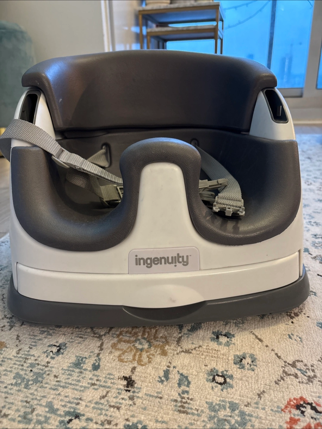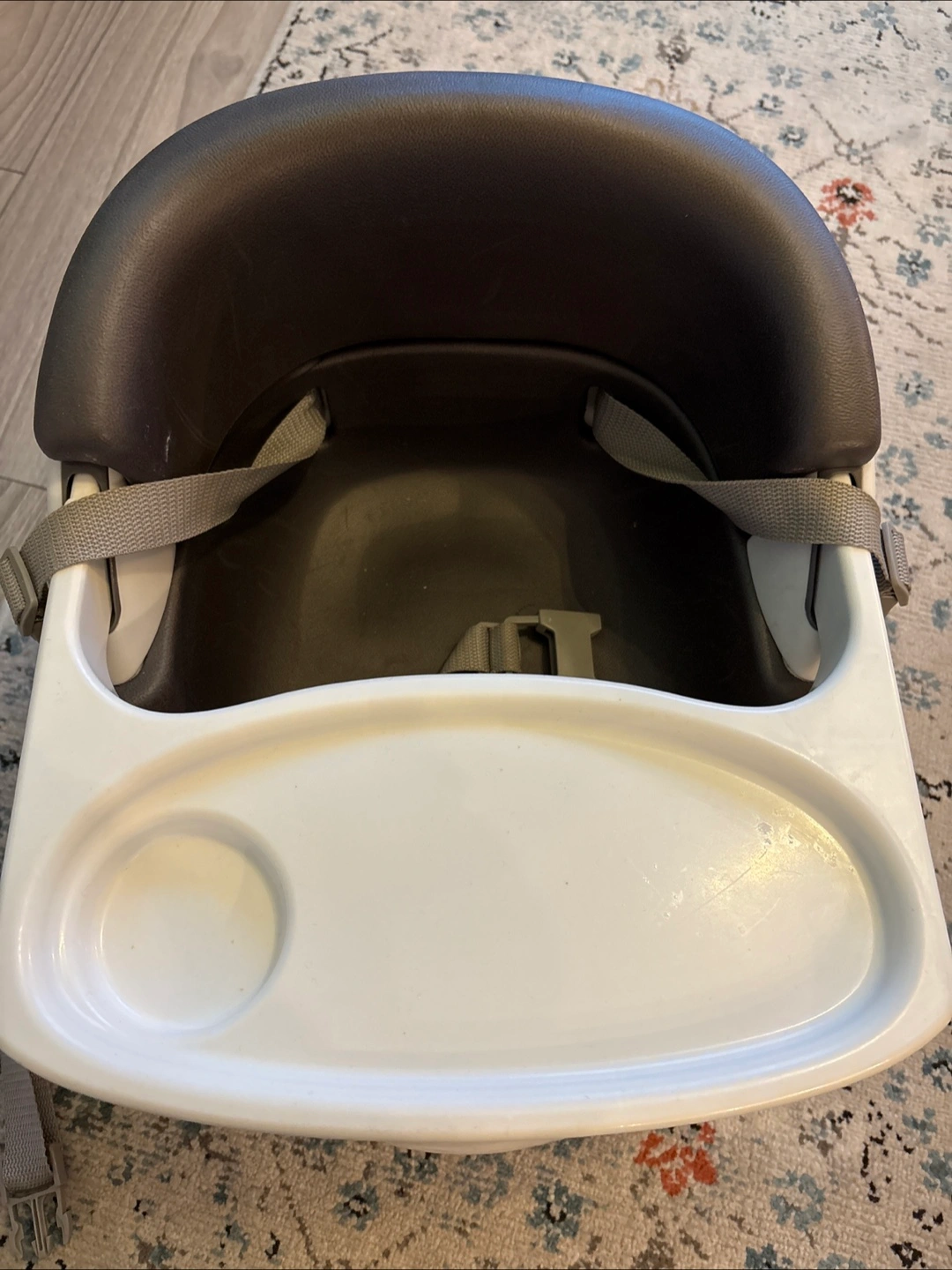 Grey and white baby booster seat. Seat has a removable tray. Includes grey straps. A great option for feeding your little one while keeping them safe and comfy. Can be attached to a normal dining chair or placed on the floor.