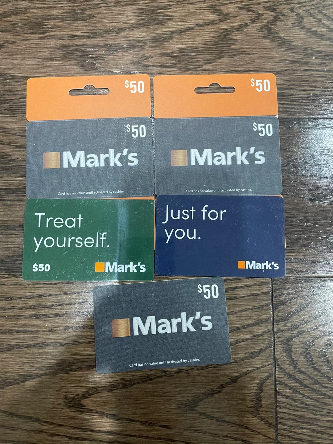 Gift cards for Mark's, with a value of $50 each. Ideally I like to get exactly what they are worth but I doubt I will so here I got them as gifts but never used them and after a career field change I probably won’t use them for a long time or ever. If you wish to meet at a Marks to confirm the balance let me know I will gladly do that. Take all 5 cards for $190 5 x $50 = $250 total 1 card for $45 $50 total 3 cards for $120 3 x $50 = $150 total Or take all for $190 Cash or e-transfers are fine The two gray ones in the back still have reference numbers