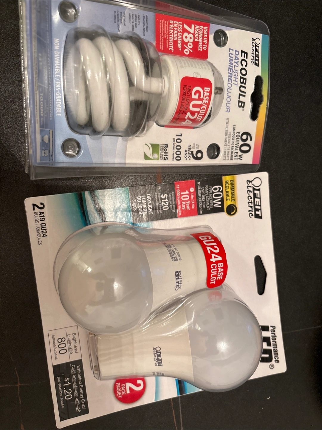 Two packs of light bulbs are visible. One features a twist-lock base, the other a dimmable GU24 base. These bulbs are ideal for creating a peaceful environment at home.