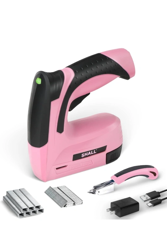 Shall Pink Electric Staple Gun, 2 in 1 Cordless Upholstery Stapler Nail Gun for Wood, 4V Rechargeable Brad Nailer Kit w/ 2500 Staples Nails, Staple Remover & Fast Charger for Crafts, DIY, Decoration.
