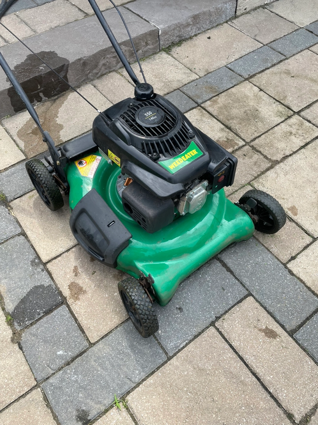 Green lawnmower. Black handle and engine compartment. Four wheels. A perfect tool for taking care of your lawn, making it a comfortable task to complete. It is in great condition and the price can negotiated.