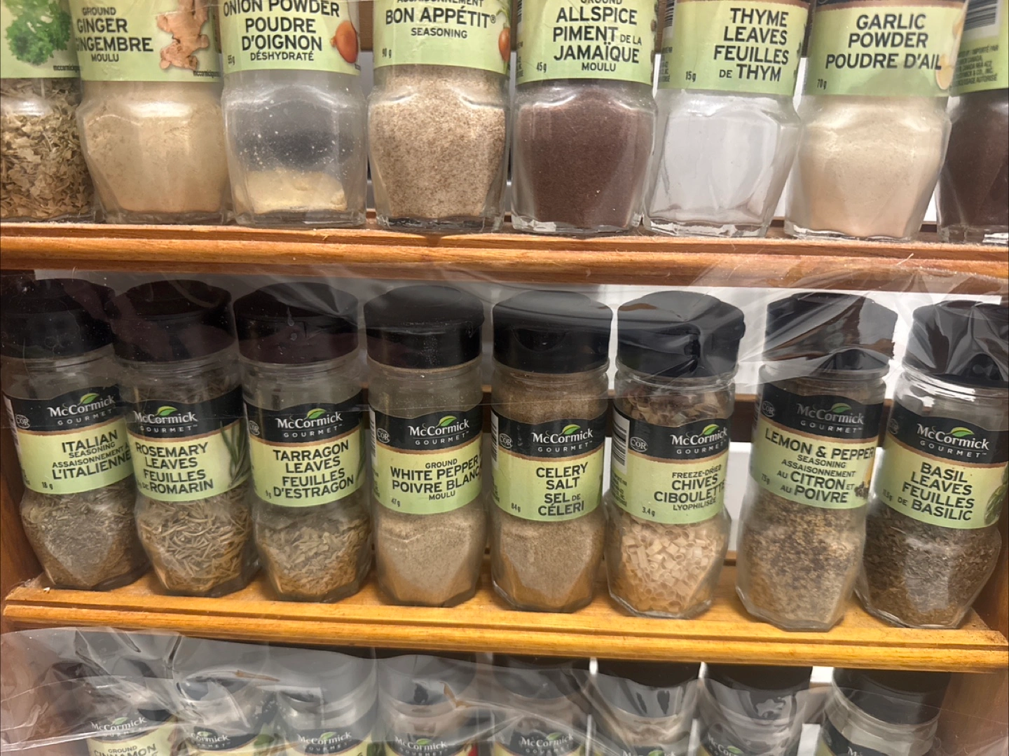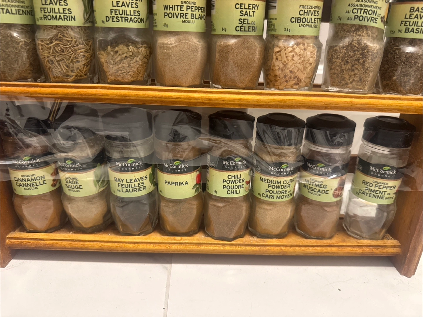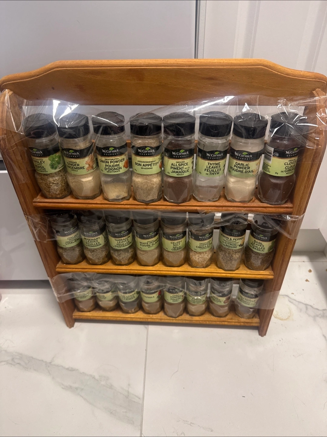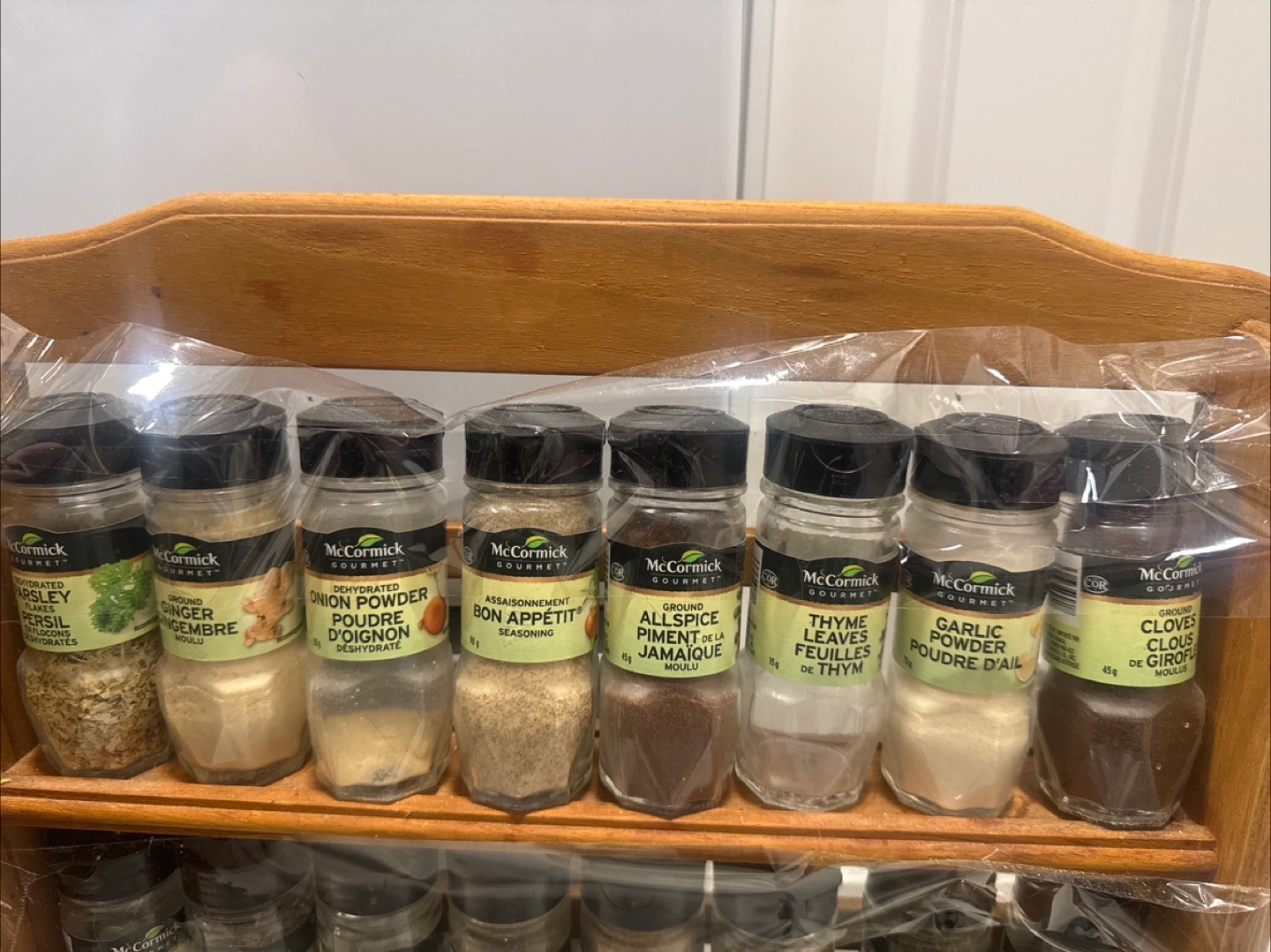 A wooden spice rack. Rack features three tiers. It comes with various jars filled with spices. Great for adding flavour to your meals. Most jars have some spices already filled but jars can be emptied.