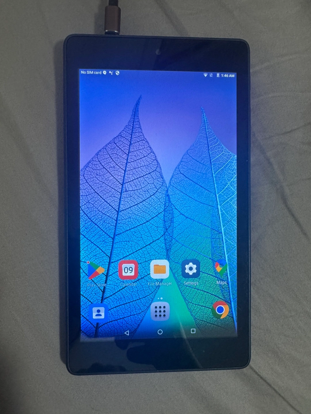 Dark-coloured tablet. Features a front-facing camera. Has an Alcatel logo on the back. Has a micro SD and micro SIM slot. A great item for reading before bed.