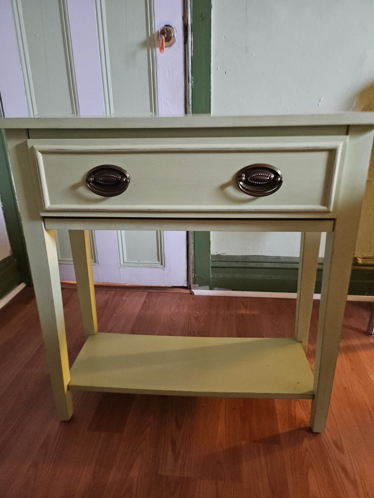 Nightstand in a pastel green color. Drawer with two handles. A convenient shelf at the bottom. Great for storing personal items.