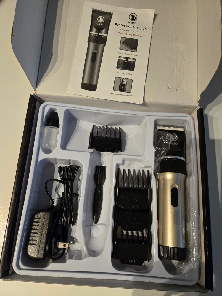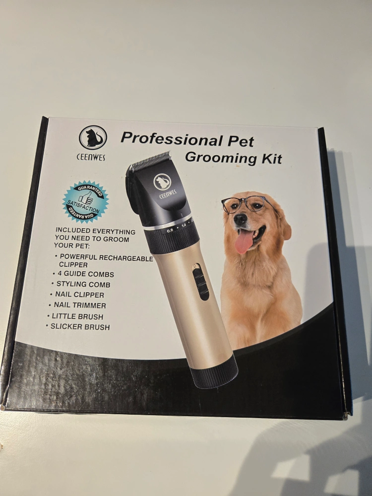 Comes in a box. Contains a clipper, guide combs, styling comb, nail clipper, little brush, slicker brush, and more. Perfect for giving your pet a relaxing grooming experience.