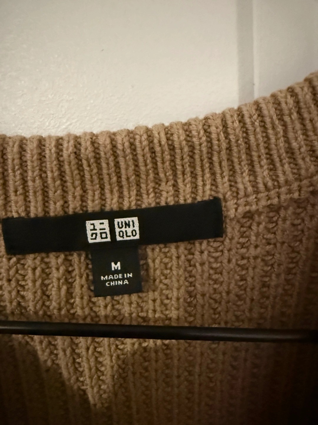 Lovely knitted vest in a neutral shade. Sleeveless design. Ribbed neckline. Perfect for layering on a cool evening, this vest provides a comfortable layer of warmth.