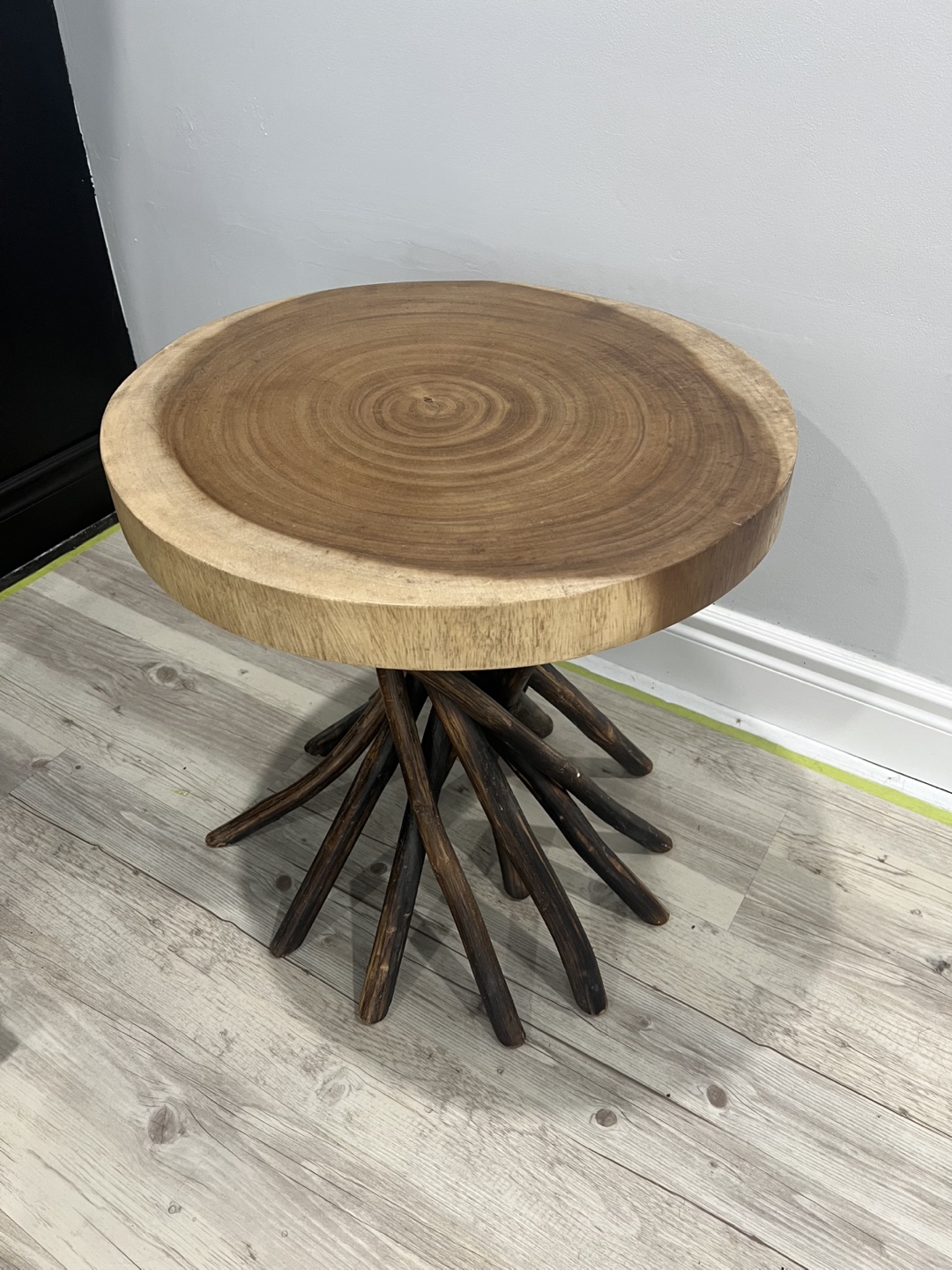 A brand new custom-made Walnut & Oak wooden side table. Featuring a round, natural wood top. The base crafted from dark-stained wood branches. Perfect for displaying your favourite book beside your favourite armchair.