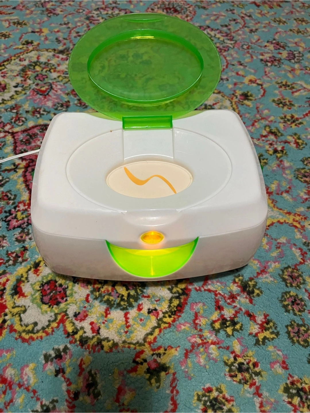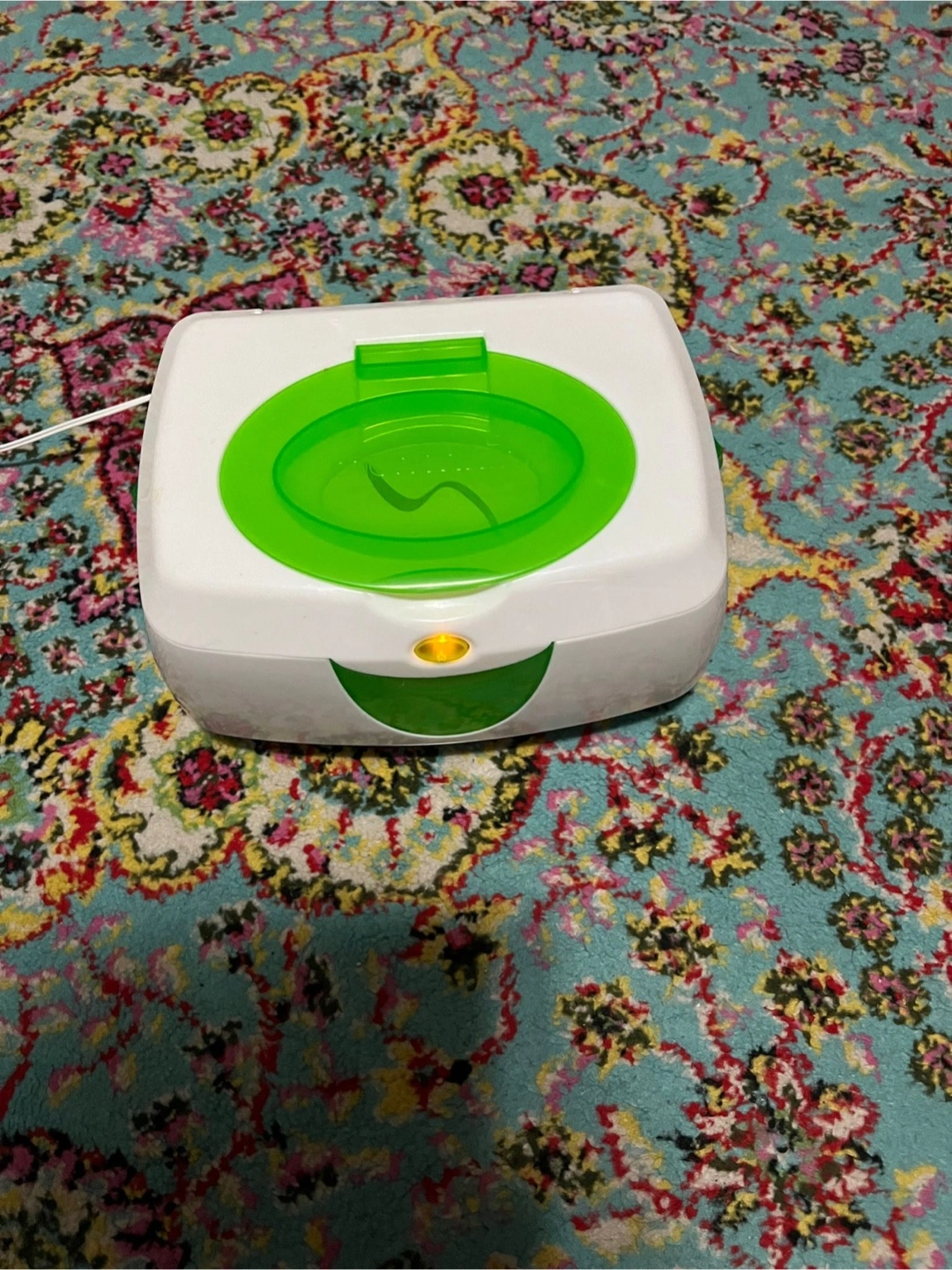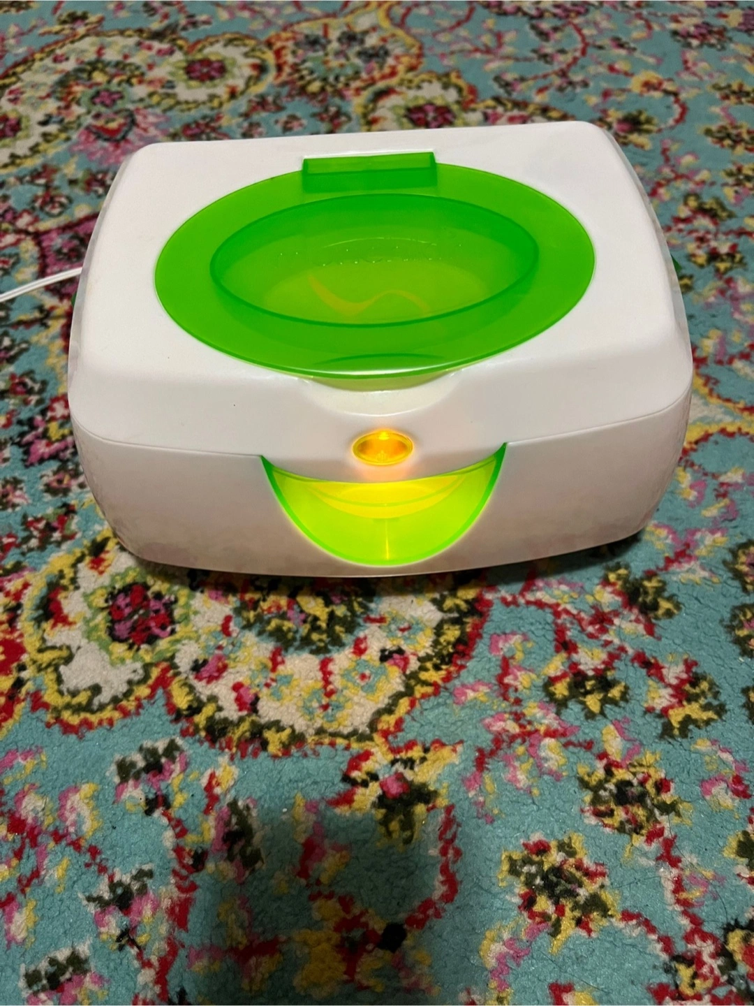 A white wipe warmer, with a green top and opening. The item has a soft light in the front. You'll appreciate having this available when you need it the most.