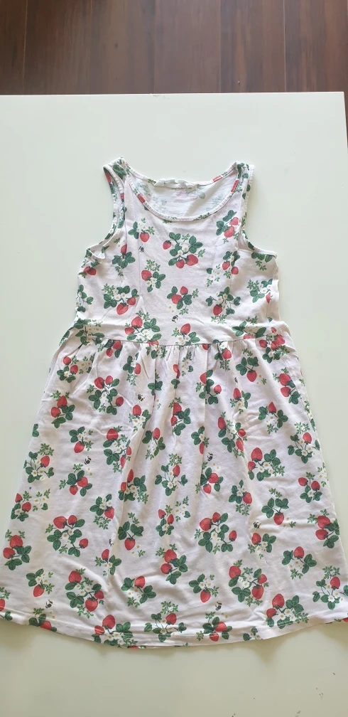 A light-coloured, sleeveless dress. Featuring a strawberry print design all over. A great dress to wear on a beautiful summer's day, for a pleasant time in the sun.