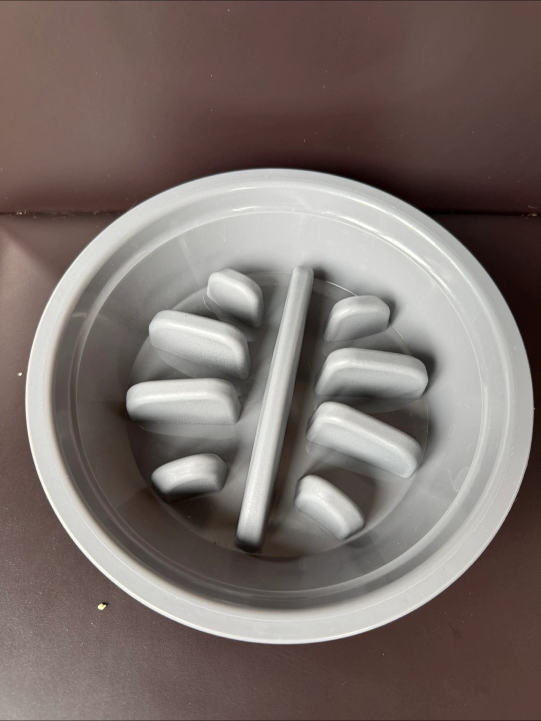132Brand new, never used round gray bowl. Designed for slow feeding , better digestion. Internal maze design with multiple raised obstructions, and a central pillar. You could use this bowl to extend the enjoyment of your pets' meals.