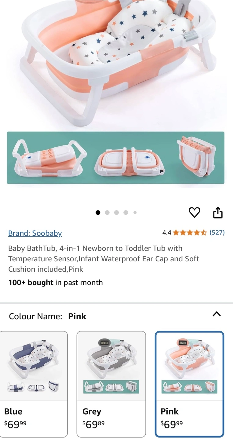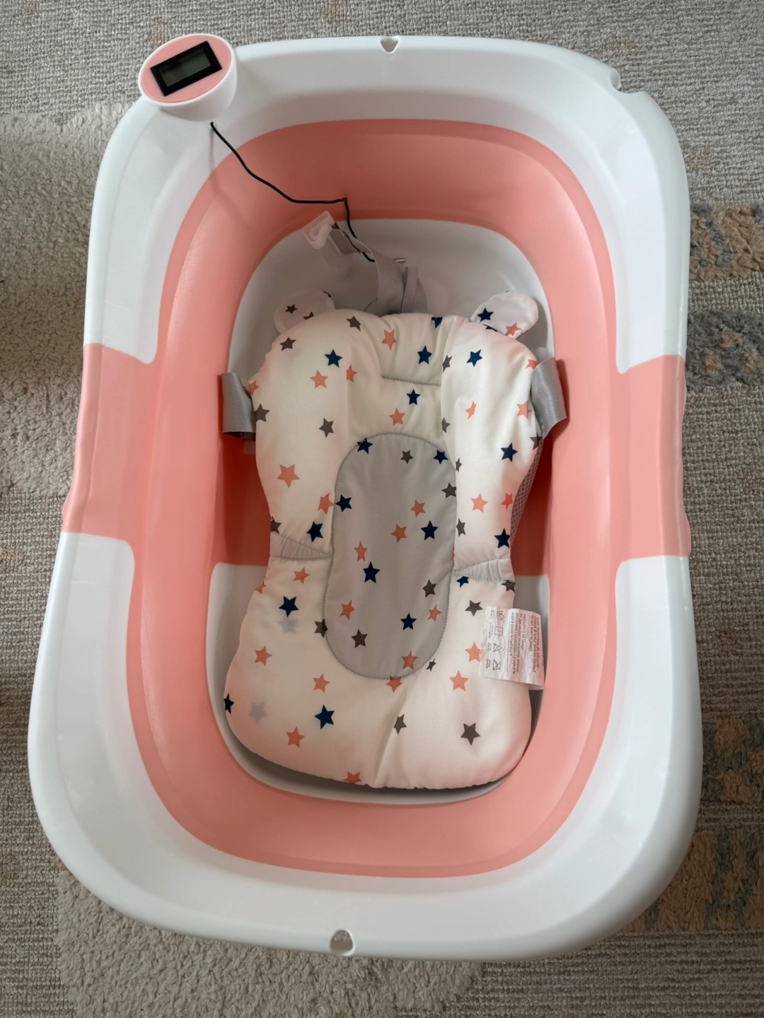 Gently used, in excellent condition. Folds flat for easy storage and comes with a built-in thermometer for safe bath temps. Includes a soft cushion insert for extra comfort. Perfect for infants and toddlers.