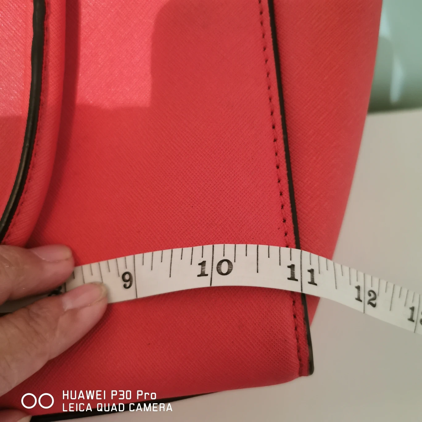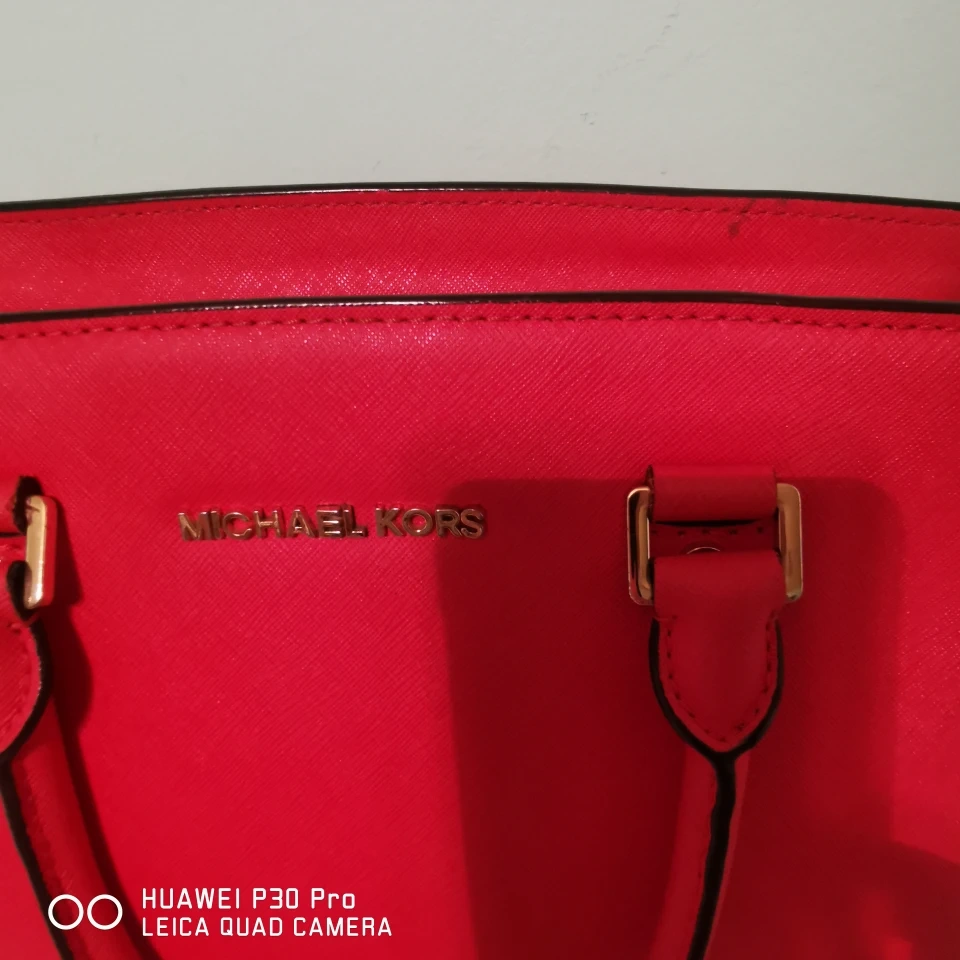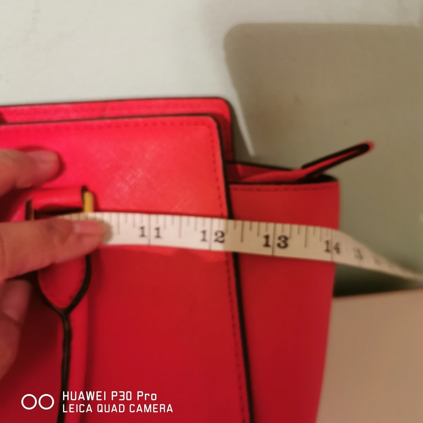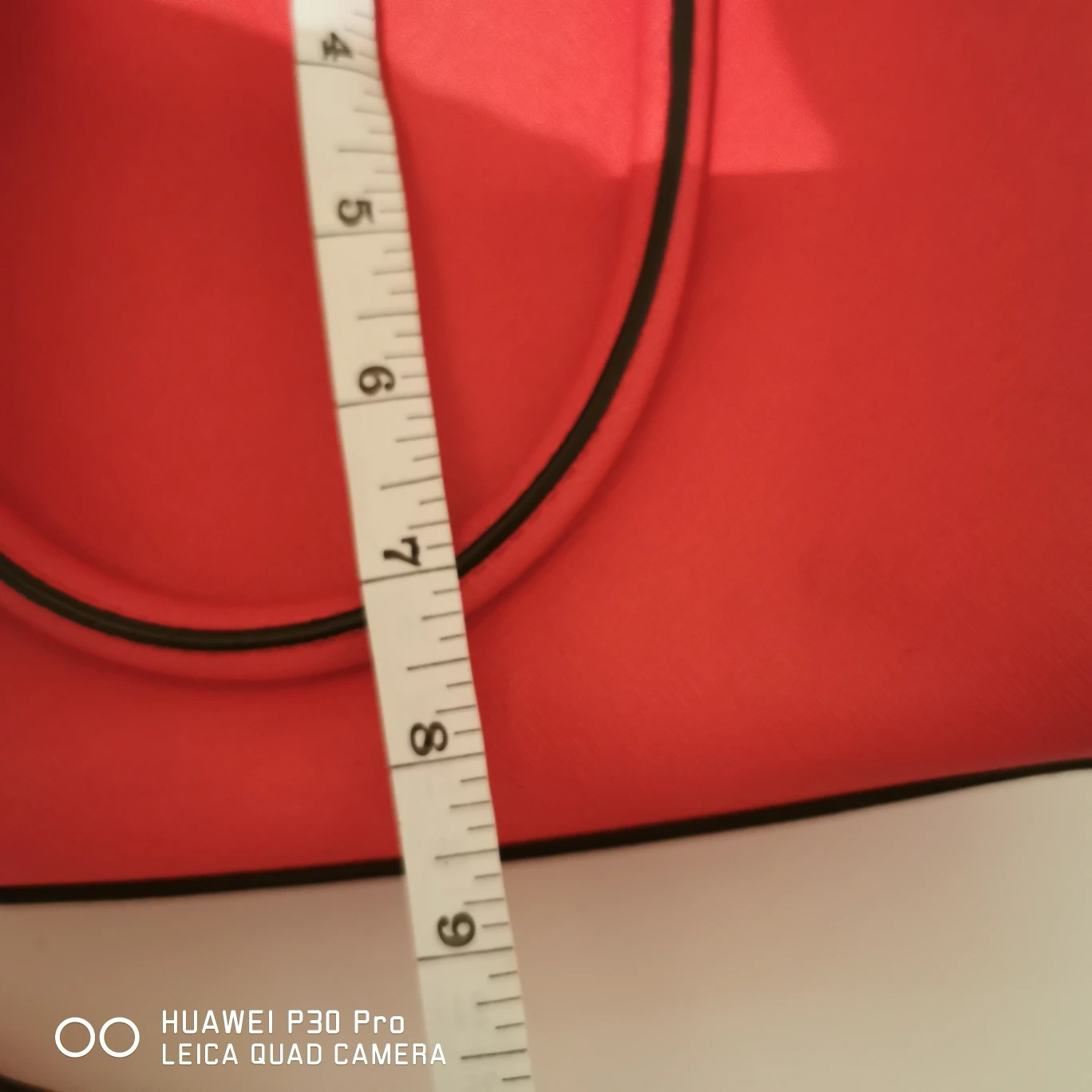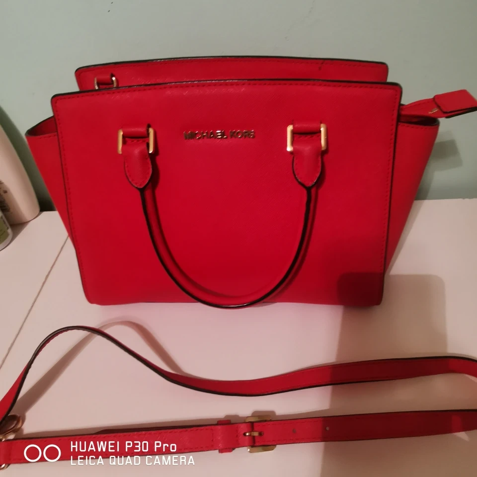 A red handbag, with a shoulder strap. Has top handles. Made of a smooth, likely leather material. The bag is a bright, cheerful red, perfect for spicing up your wardrobe. You can use this bag to take with you on a relaxing day out.