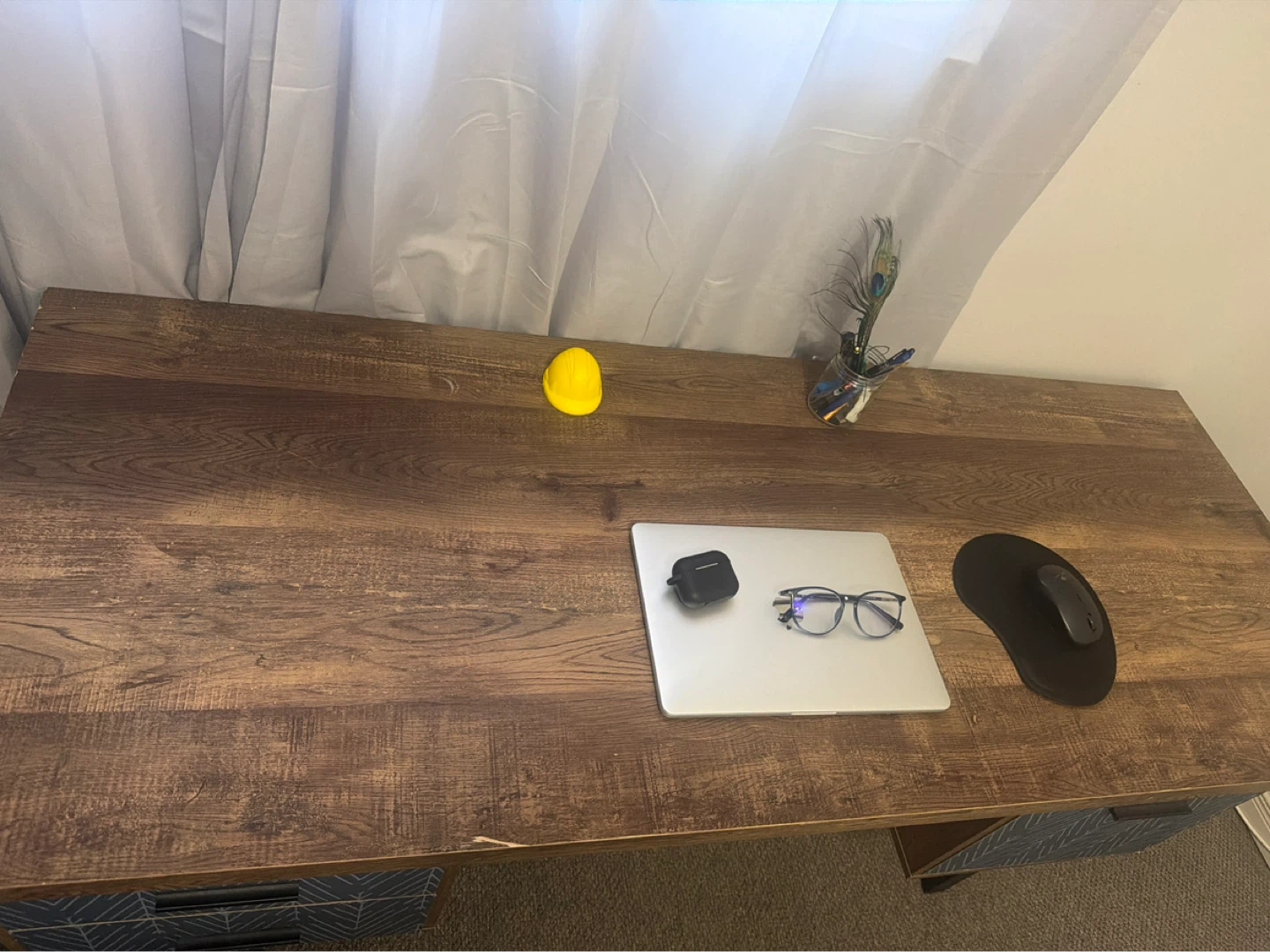 Rustic Wood Desk with Blue Patterned Drawers
