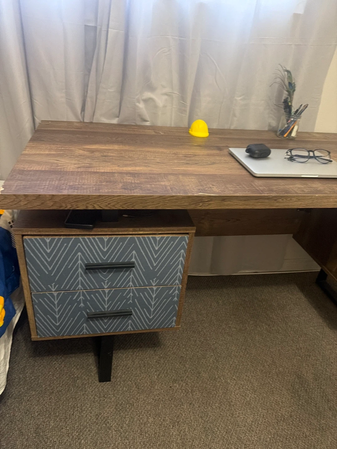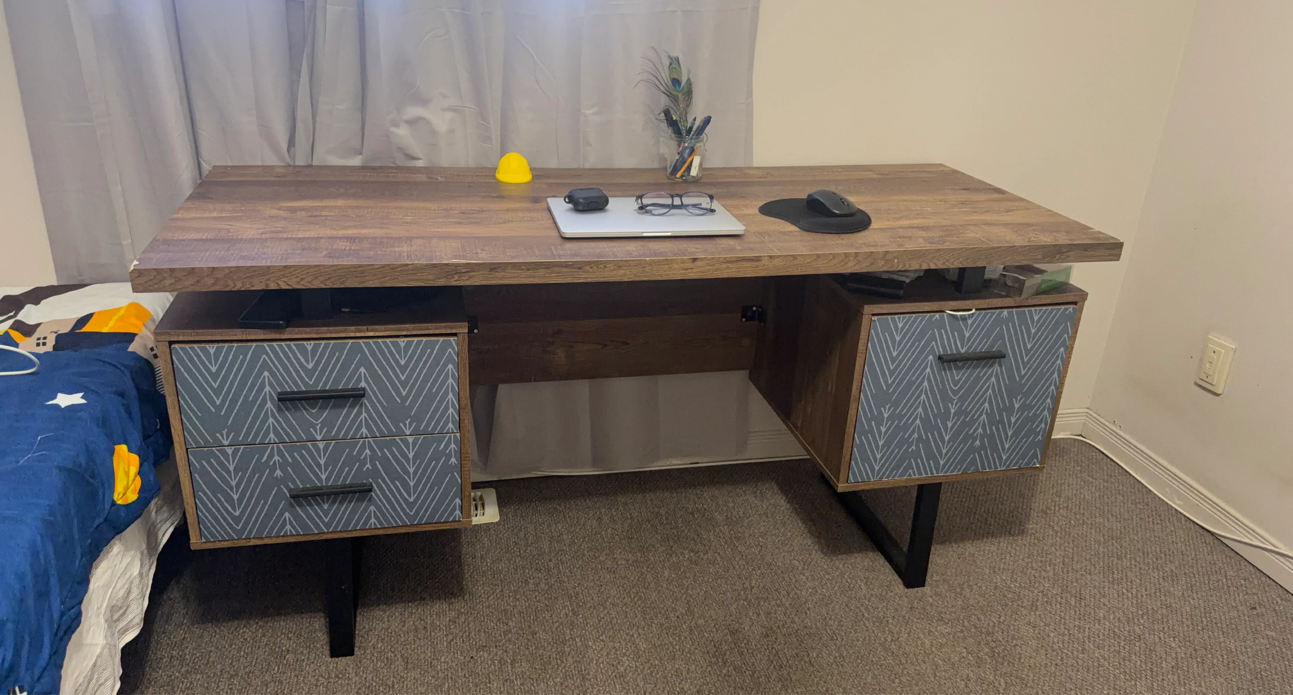A sturdy desk featuring a rustic wood finish top and two drawers with a stylish blue geometric pattern. It's perfect for a home office or study space! Drawer fronts have a patterned design.