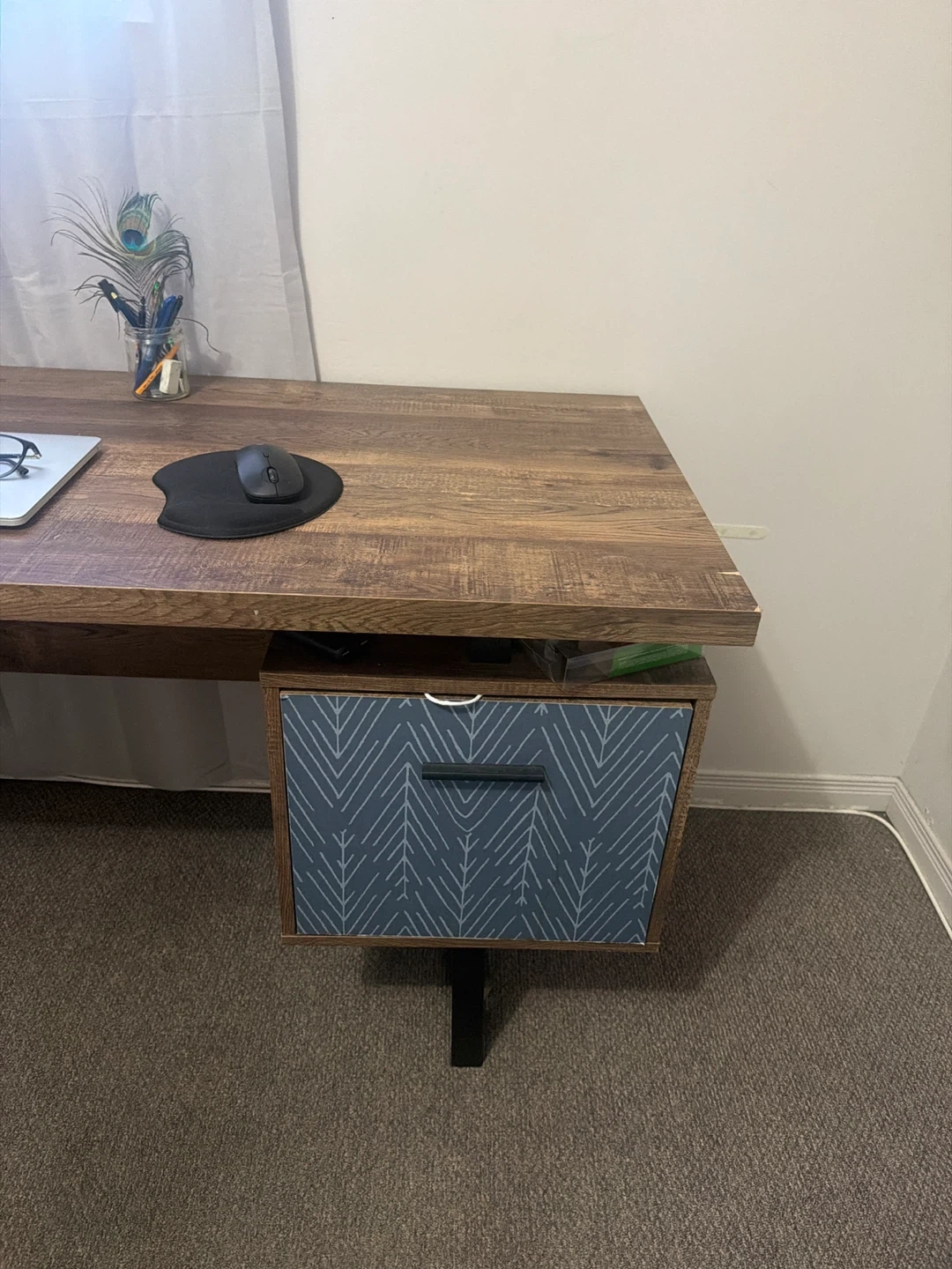 Rustic Wood Desk with Blue Patterned Drawers