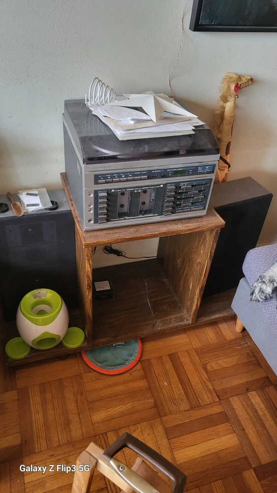 A retro AM-FM stereo system. It has a cassette deck and a turntable. Speakers and stand are also included.