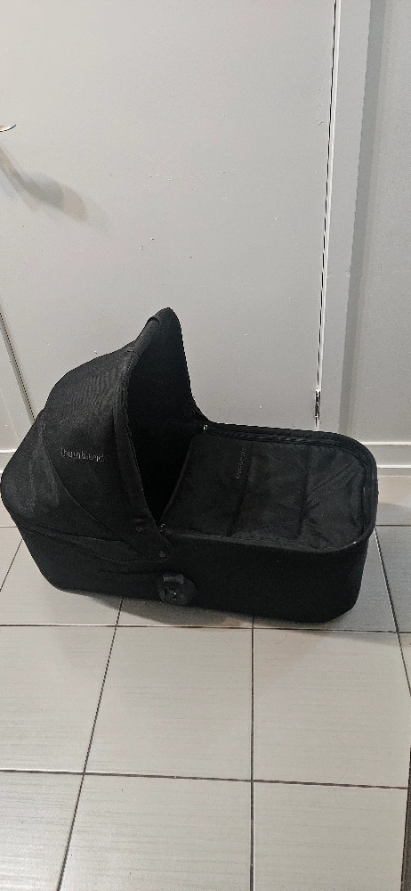 Black bassinet. Constructed of a fabric material. Features a hood and a carry handle. Perfect for peaceful strolls with your baby.