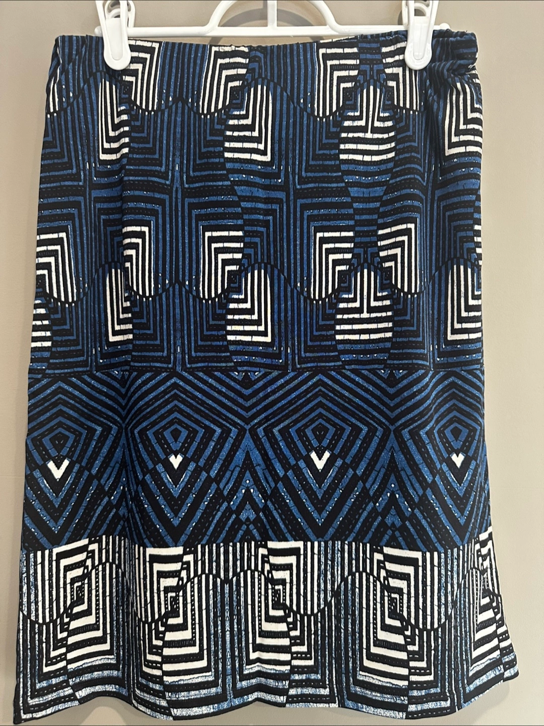 This gorgeous stretchable skirt is perfect for your next outing. Featuring a fun geometric pattern in blue, black, and white. Viscose fabric feels cool when heat