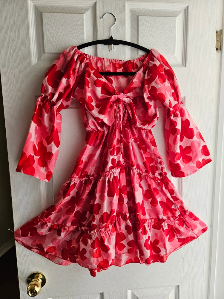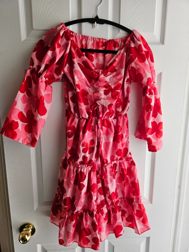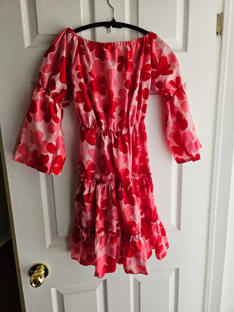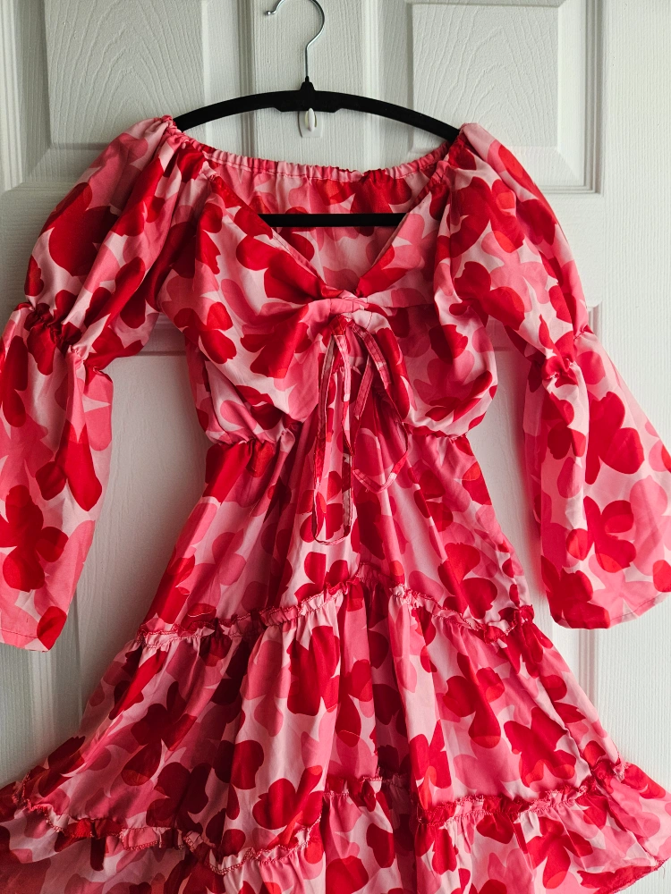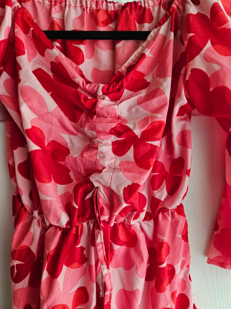 Off the shoulder design with long, wide sleeves. Dress with a flowered patten