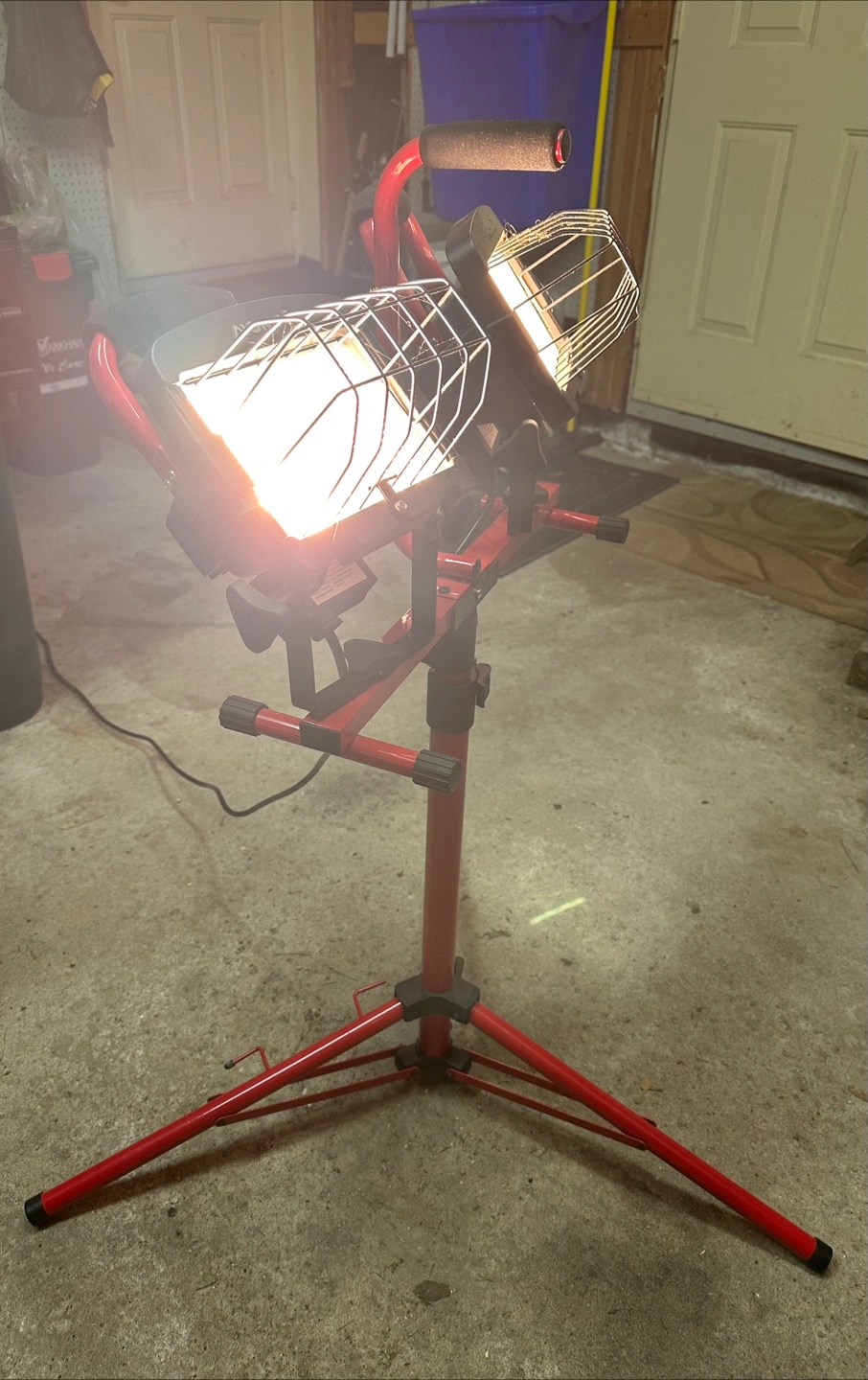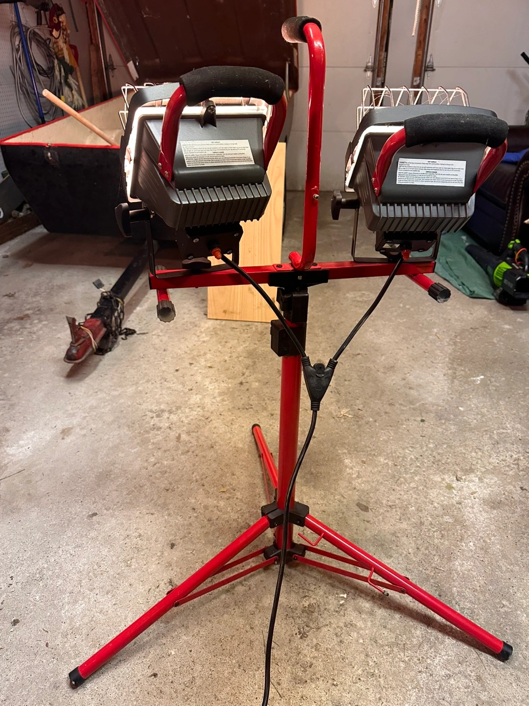 The light is mounted on an adjustable tripod, allowing it to be positioned at different heights and angles. This makes it versatile for various work environments.
