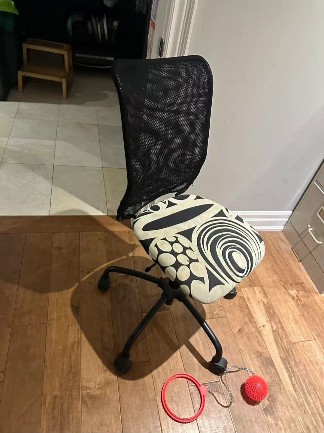 This office chair features a breathable mesh back for comfort. It has a distinct black and white patterned seat. Swivels and rolls easily on its casters.