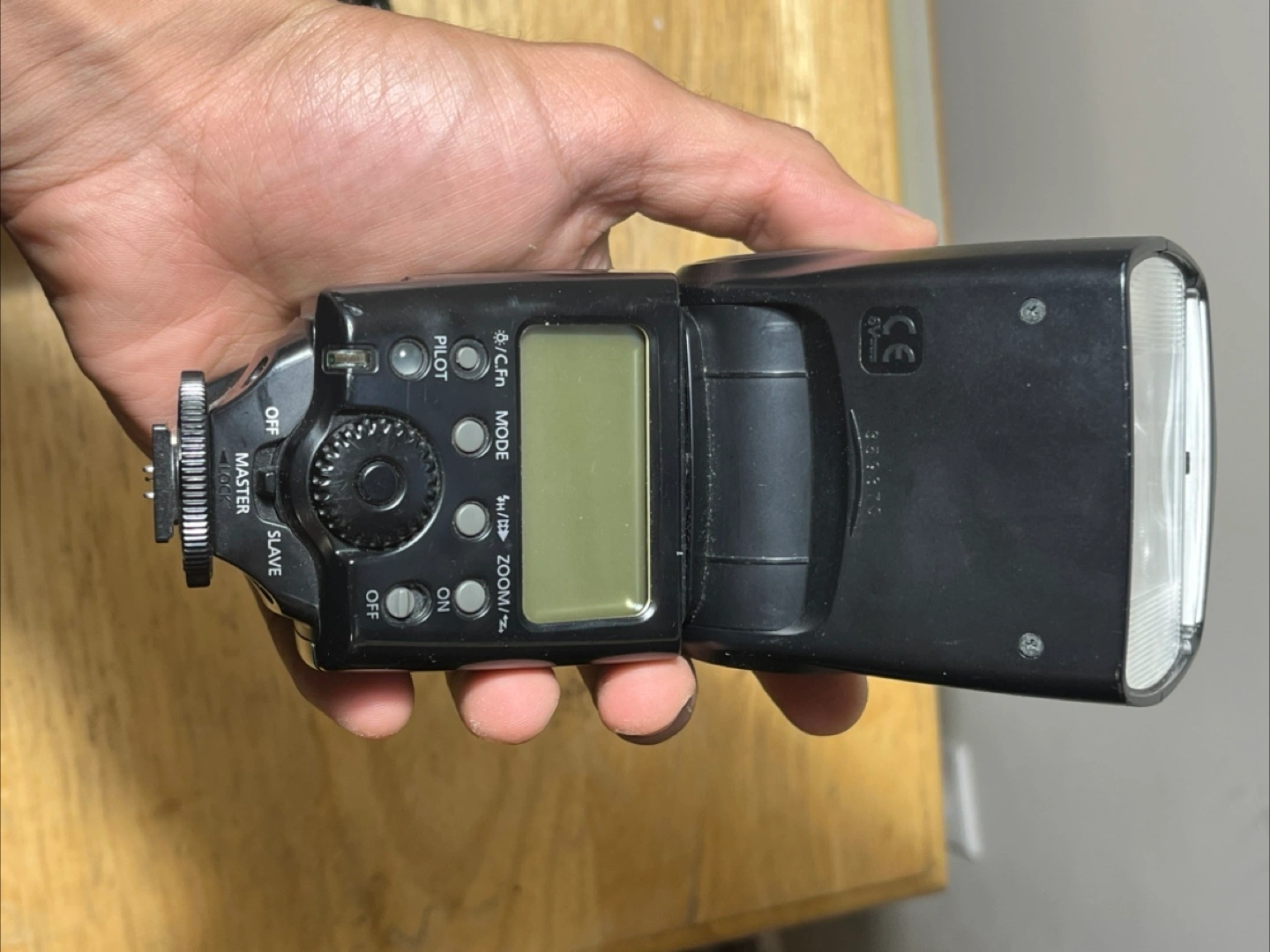 A Canon speedlite flash. Appears to be black in colour. Has a screen with buttons. The head is adjustable. This flash would be great to use for photography in low-light conditions.