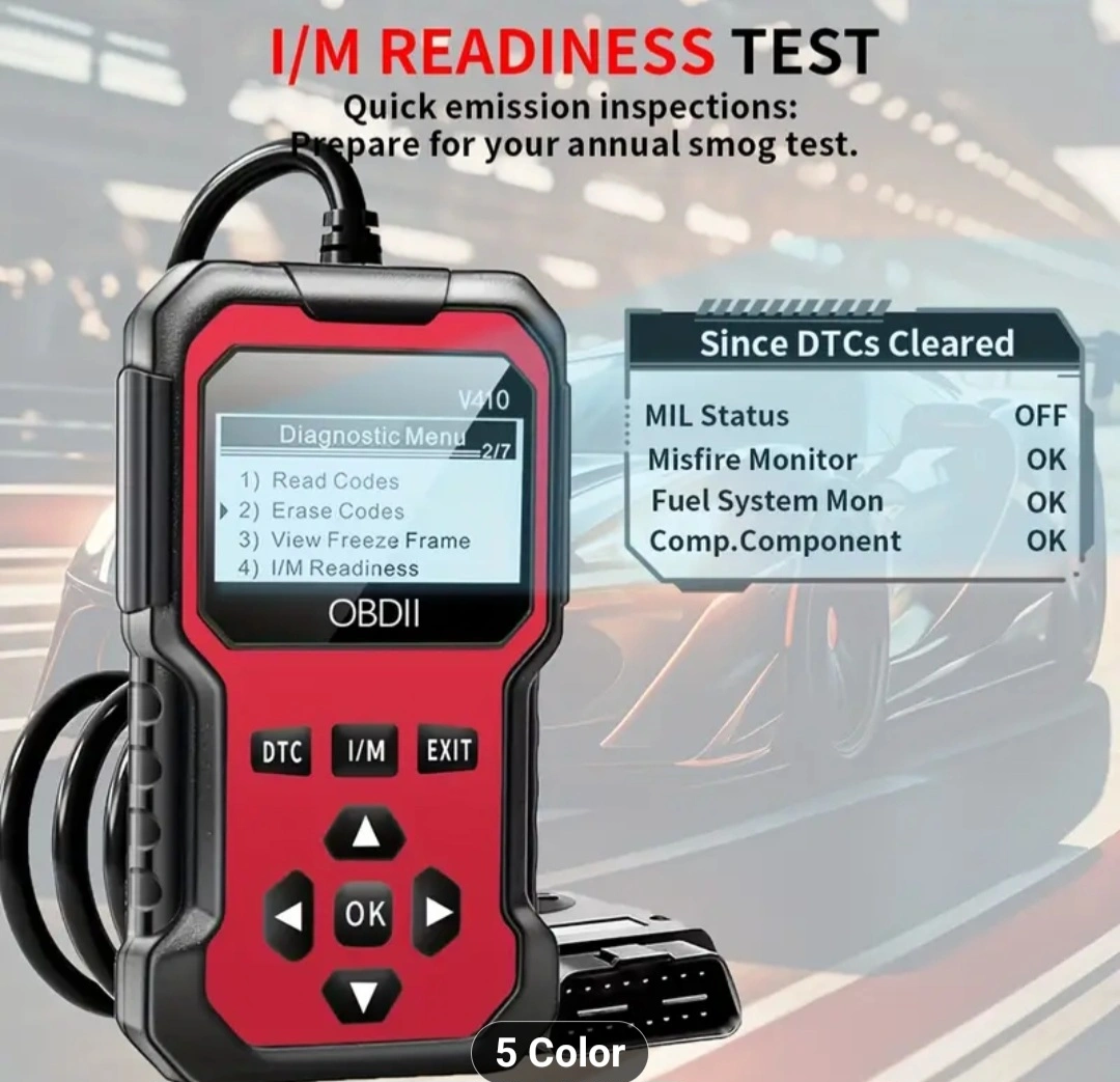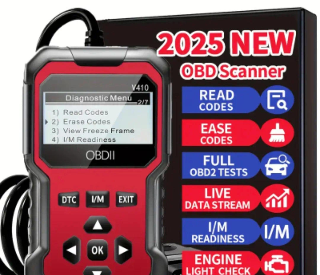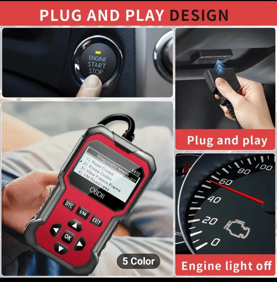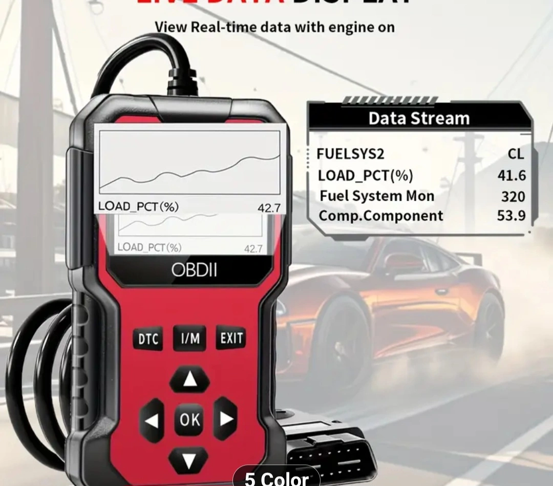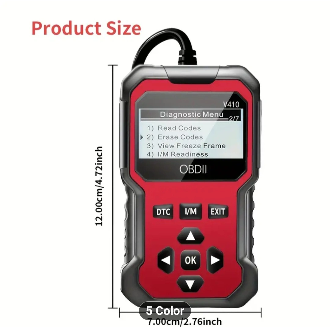 Red and black diagnostic scanner. Features buttons to navigate menus. The size is approximately 7.00cm by 12.00cm. Perfect for tracking and assessing your car’s performance.