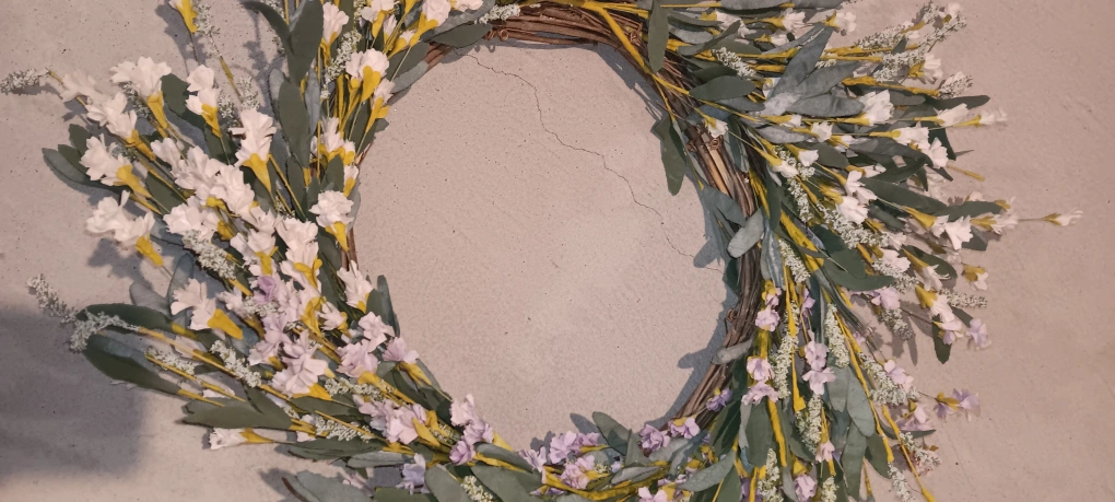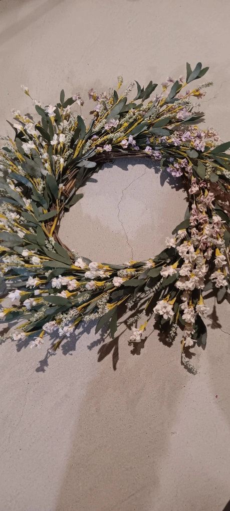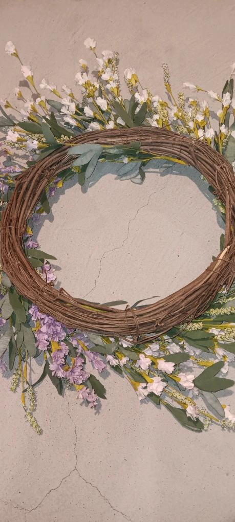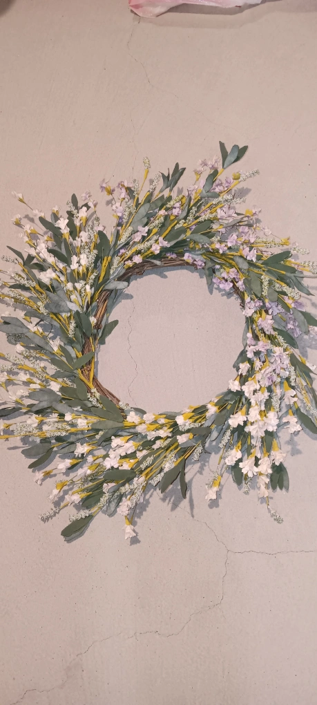 483A pretty floral wreath. Composed of leafy greenery, small white, and purple flowers. A simple brown ring base. Perfect for bringing some calm into your home.