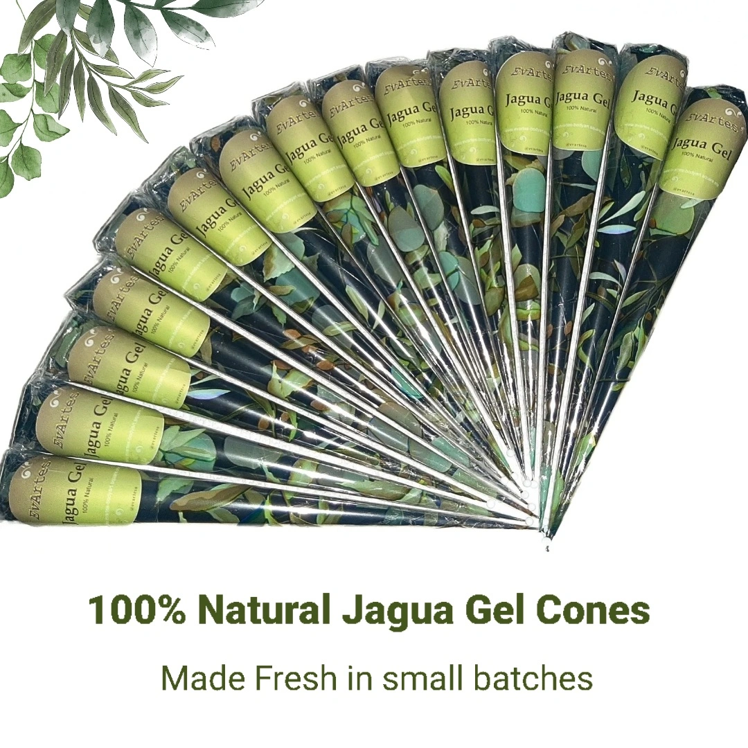 Experience the allure of intricate body art with these 100% Natural Jagua Gel Cones, designed to deliver an ultra dark mehndi henna stain that's both captivating and long-lasting for up to 3 weeks. These cones are made fresh in small batches, and contain organic pure jagua juice to ensure a dark blueish-black color that resembles a permanent tattoo.