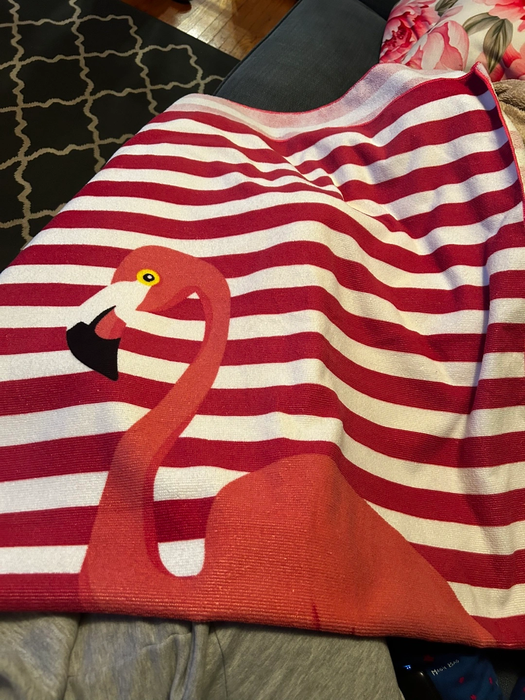 Features a pink flamingo design on the bottom. Has red and white stripes across the rest of the towel. This is a lovely item for laying down on the beach to soak up the sun. #freecycle