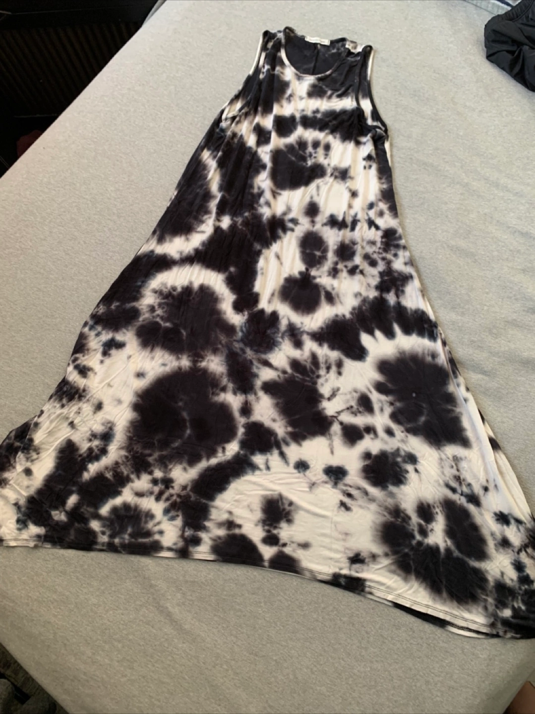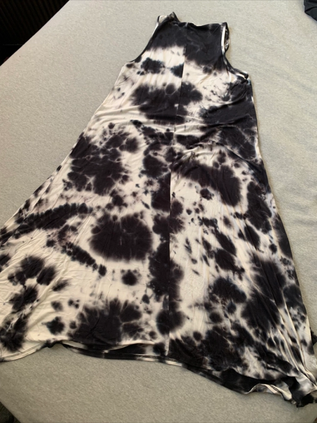 The dress has a unique tie dye pattern. Sleeveless and very comfortable. Very forgiving slinky fabric.