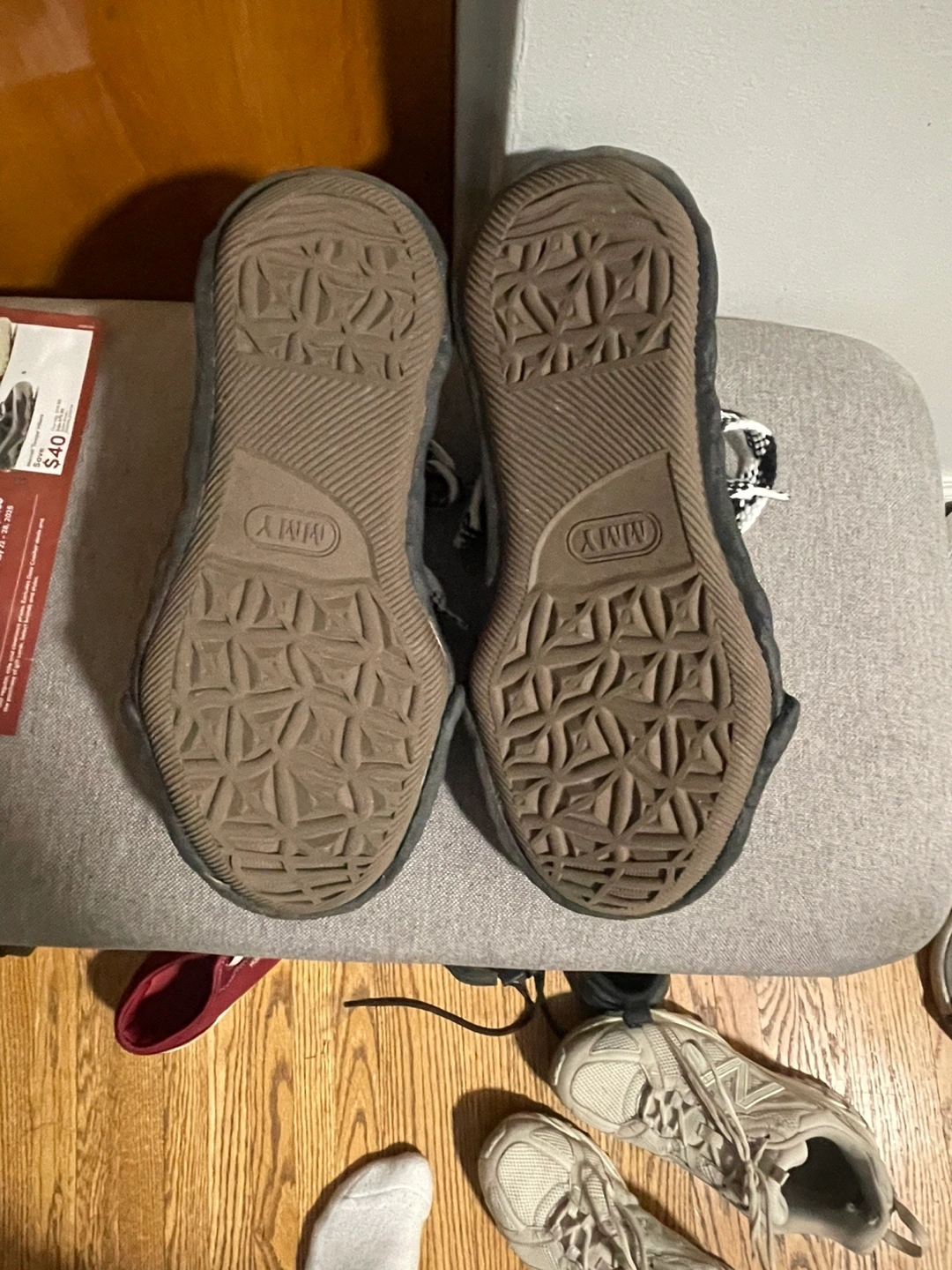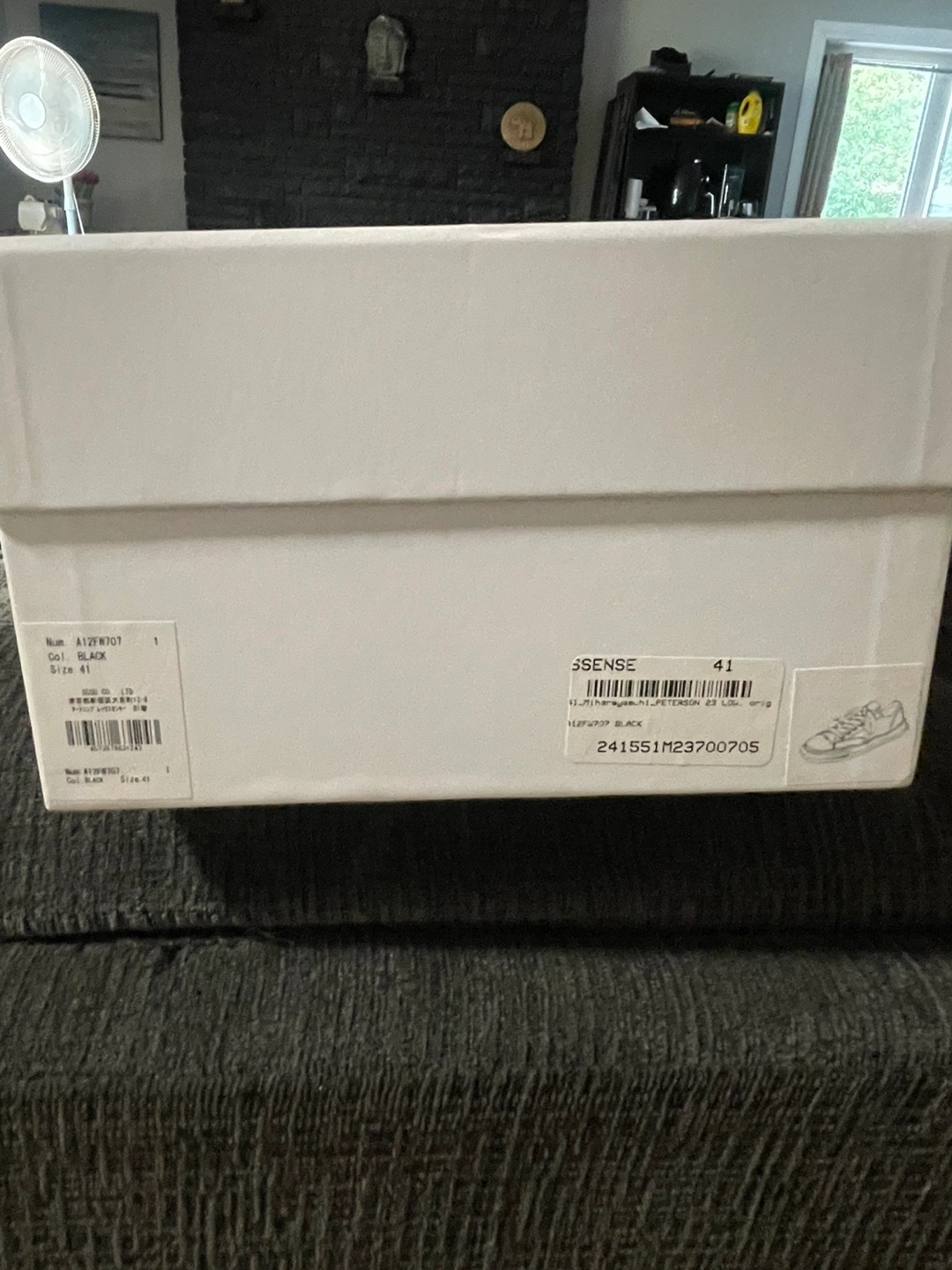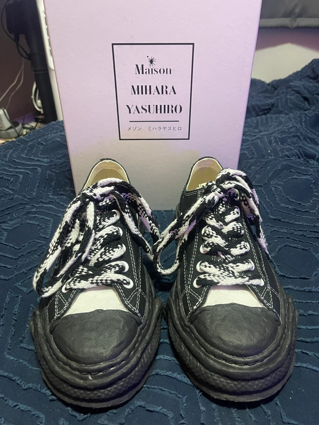 Classic black sneakers. Thick, wavy sole. White stitching and laces. Unique and chic.